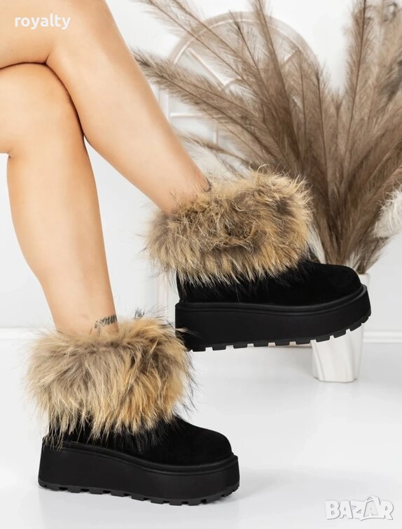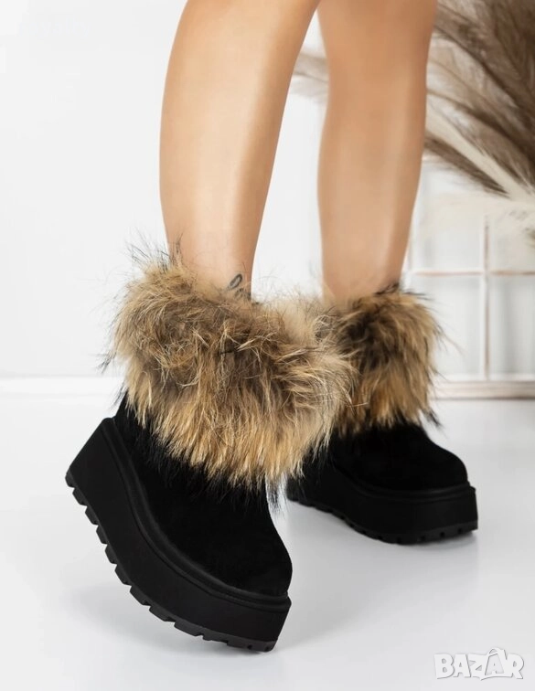 Боти на платформа - черен ЕСТЕСТВЕН велур с бежов ЕСТЕСТВЕН косъм