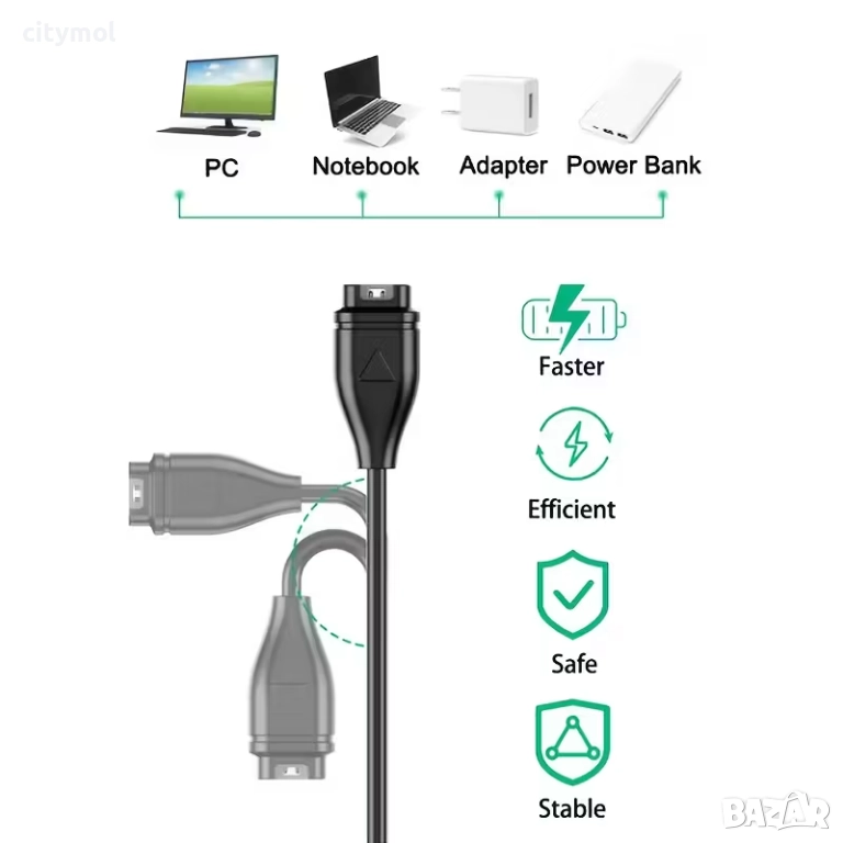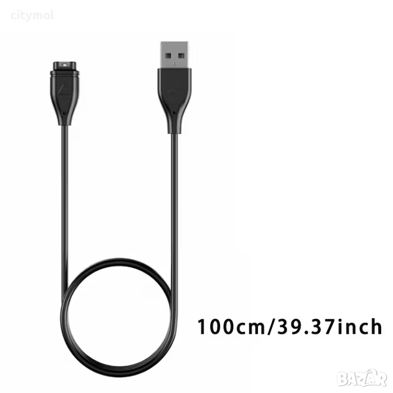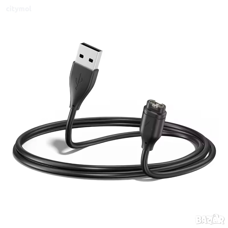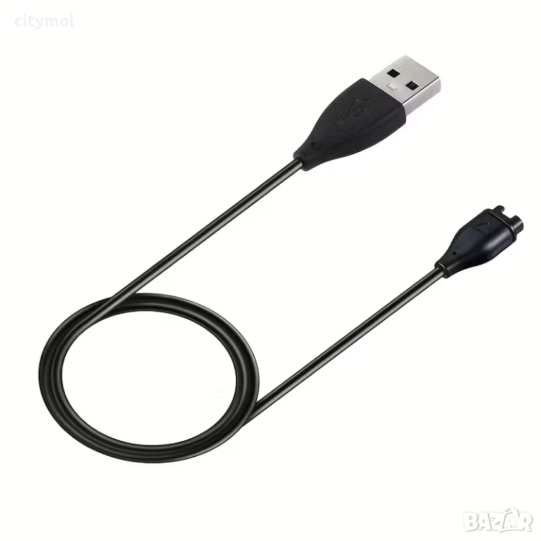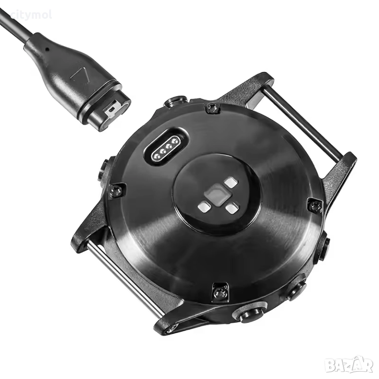 Магнитно зарядно за смарт часовник Garmin. Разполага със USB за връзка със захраващ адаптер. Използвайте само надежни зарядни, за да си гарантирате безопасно и бързо зареждане, както и дълъг живот на батерията.