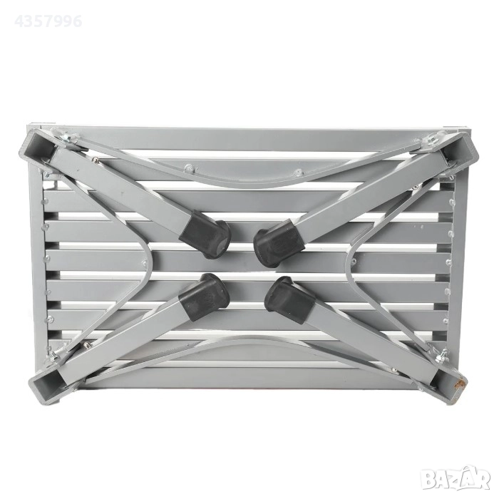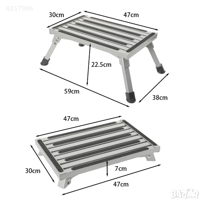 Горната повърхност е оборудвана с антислип ленти, осигуряващи стабилно стъпване при сухи и мокри условия. Краката са снабдени с гумирани накрайници, което предотвратява приплъзване върху различни настилки. Механизмът за сгъване позволява степенката да се прибере компактно до височина само 7 cm, което я прави идеална за транспорт и съхранение.