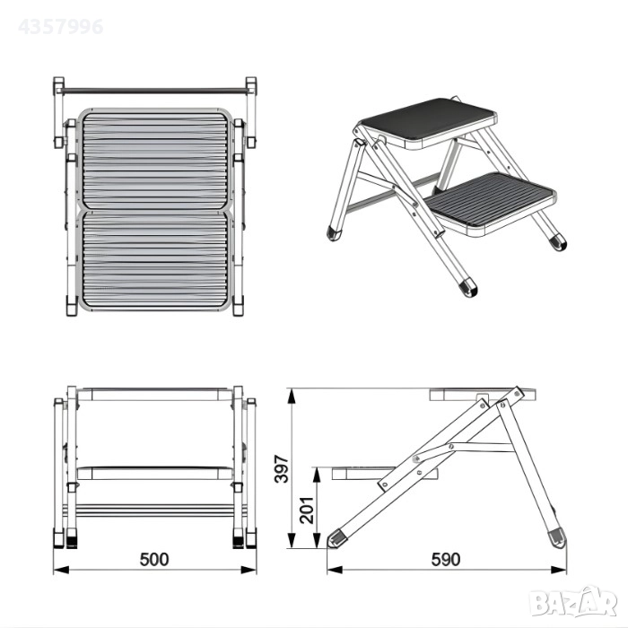 Сгъваем дизайн – Позволява бързо и лесно сгъване, така че стълбата заема минимално място при съхранение или транспорт.