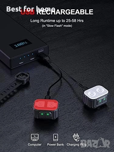 ИНДИКАТОР ЗА ДЪЛГО ВРЕМЕ НА РАБОТА И БАТЕРИЯ - Нашата предна светлина за велосипеди е оборудвана с батерия с голям капацитет 1100MAH, а задната светлина е 350MAH. В режим "Бавно мигане" фаровете могат да издържат до 58 часа, а задната светлина - 25 часа. Когато батерията е под 20%, индикаторът на превключвателя ще мига зелено, за да ви напомни да заредите светлината, никога не се притеснявайте, че ще ви свърши батерията.