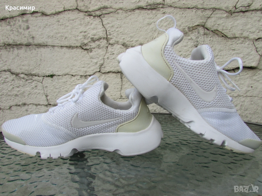 Дамски маратонки Nike Presto Fly, с еластична мрежеста горна част, подобно на чорап за удобно прилягане и дишаща текстилна подплата за добро проветрение на краката. Имат подплатена яка добавяща комфорт около глезена, TPU пластмасова конструкция за странична стабилизация и опора, и гумена подметка с гъвкави канали за естествено движение. Номер 37,5 с дължина на стелката 23,5 см. Произведени във Виетнам.