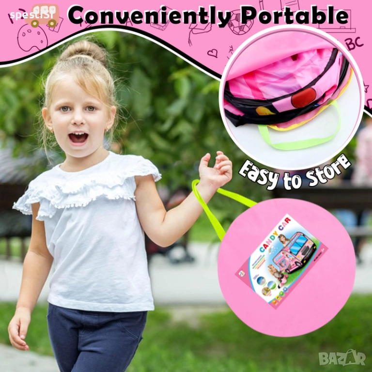 Подарете на децата си билет за най-сладкото приключение с тази очарователна къщичка за игра. Дизайнът, вдъхновен от класически камион за лакомства, е изпъстрен с апетитни илюстрации на понички, хот-дог и сладоледи, които веднага грабват детското внимание. Това не е просто палатка, а собствено пространство, където малките могат да развихрят въображението си, влизайки в ролята на майстор-сладкари или нетърпеливи клиенти.