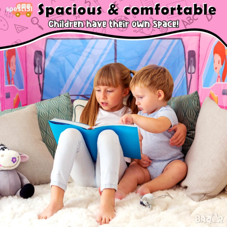 Просторният интериор позволява на няколко деца да играят заедно, насърчавайки комуникацията и споделената игра. Достъпът е проектиран да бъде максимално интерактивен – децата могат да влизат, да излизат и да надничат от различни страни, което прави криеницата още по-интересна. Независимо дали е разположена в детската стая за уютни игри или на двора за слънчев пикник, тази цветна конструкция се превръща в център на радост. Тя е перфектният декор за незабравими детски спомени, изпълнени с усмивки и въображаеми вкусотии.