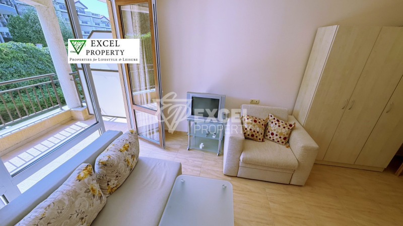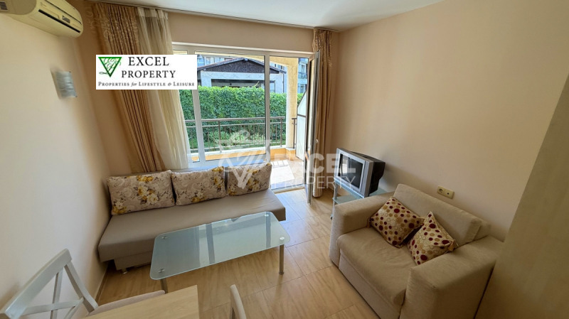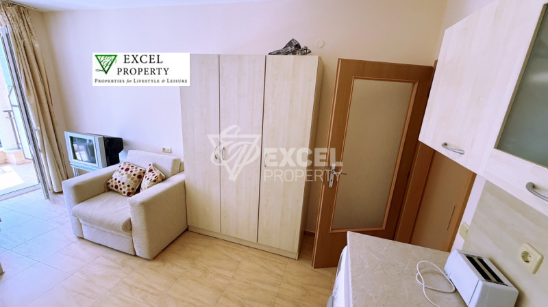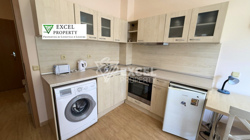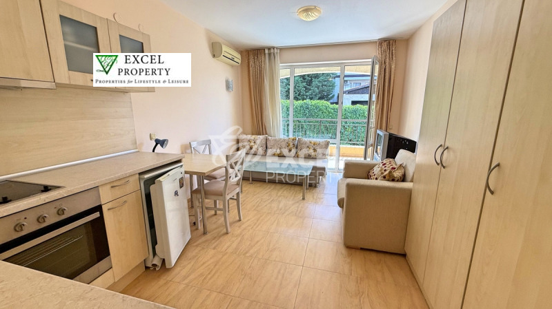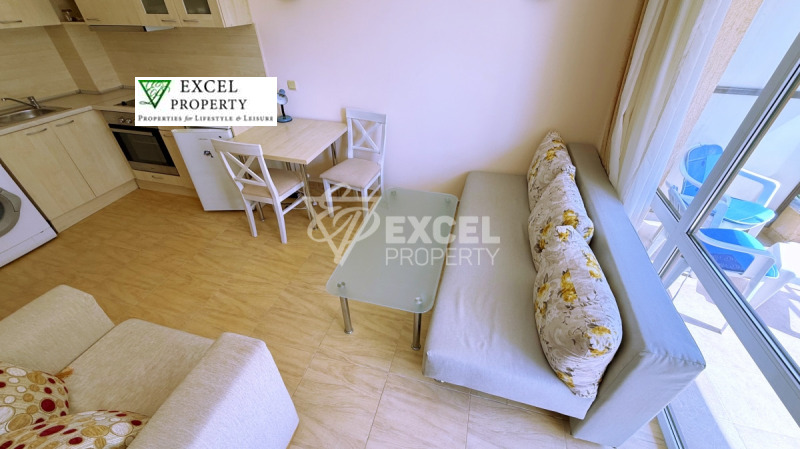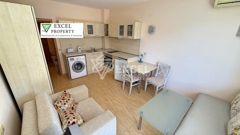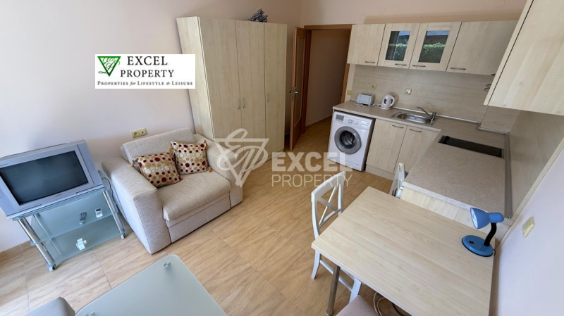 Обзаведено студио на 200м от морето в Свети Влас, комплекс Аква Дриймс !!! Ексел Пропърти предлага за продажба студио подходящо отдаване под наем или за целогодишно ползване в Свети Влас. Имота се намира в комплекс Аква Дриймс, само на 200 метра от плажа. Разположено е на втория етаж и е с обща площ от 40 кв.м. Пространството е разпределението между входно антре, просторна всекидневна с кухненски бокс, баня и балкон. Обзавеждането включва разтегателен диван, масичка за кафе, маса за хранене с четири стола, ТВ шкаф и кухня с всички уреди като фурна, котлони, хладилник и аспиратор и пералня. Балконът е с добър размер, има източно изложение е разполага с външна мебел. На разположение е климатик и оборудвана баня, готово е за отдаване под наем или за ползване от новите собственици. Сграда е предвидена за целогодишно ползване, асансьорът работи и зимата. Комплексът е с АКТ 16 и разполага с ресторант, два басейна и зона за шезлонги и чадъри. Таксата поддръжка е 10,5 Евро/м2.