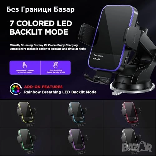 Нов Автоматичен държач за телефон кола 15W Qi зарядно с 7 LED режима