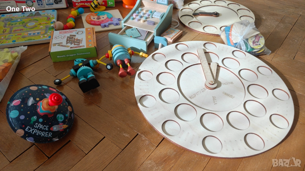 Образователни дъски/Календари (2 бр.): Големи кръгли дървени основи за учене на часовника, сезоните или дневния режим (включват подвижни елементи/стрелки).