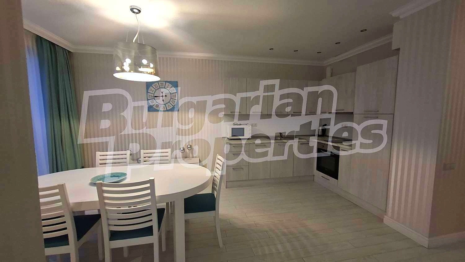 Имотът се състои от просторен дневен тракт с кухненски бокс, напълно оборудван с висок клас електроуреди хладилник, фурна, миялна машина, пералня и климатик. Разполага с три самостоятелни спални, две модерни бани с тоалетни (едната с душ кабина, а втората с перално помещение) и две тераси с великолепна гледка към морето и басейна на комплекса.
