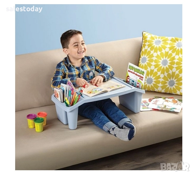 Детско пластмасово бюро-масичка в сив цвят, което се поставя върху краката на детето, докато седи.