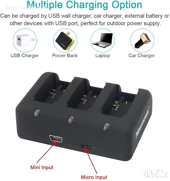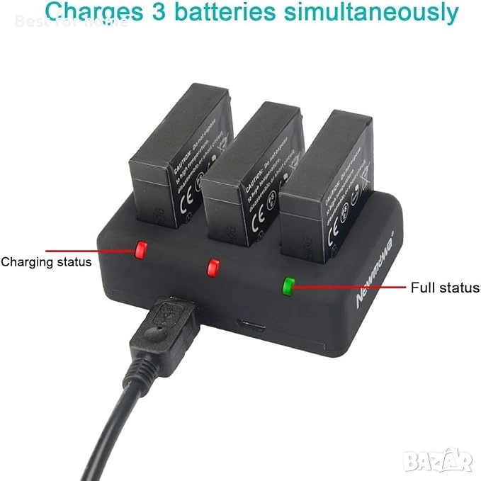 Зареждане на 3 батерии едновременно: Иновативен дизайн, позволяващ едновременно зареждане на 3 или 2 батерии, и 3 независими интелигентни LED светлини, показващи ЧЕРВЕНО при зареждане и ЗЕЛЕНО при завършване