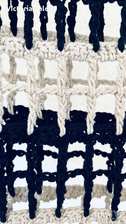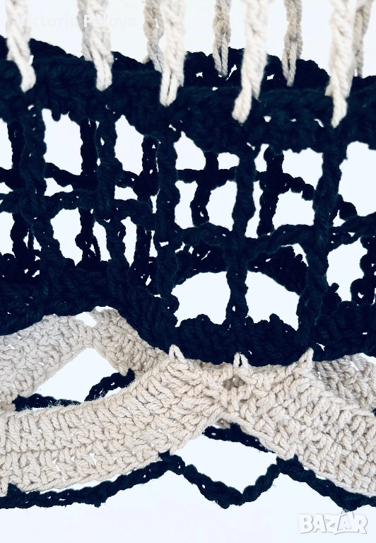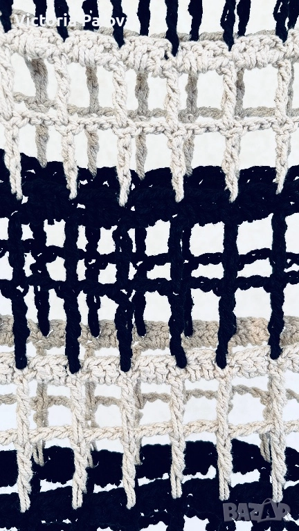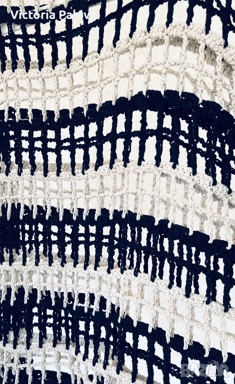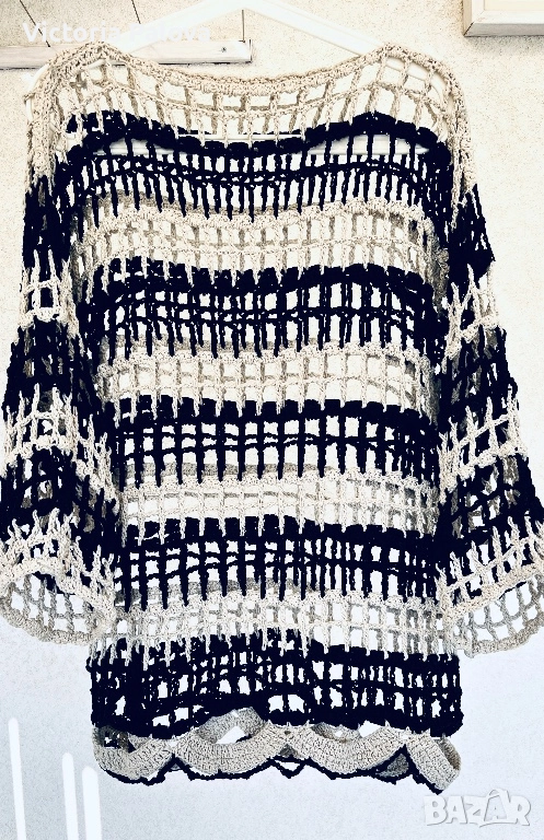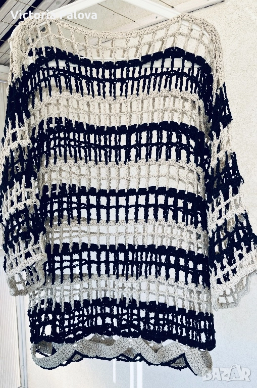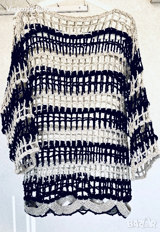 Блуза/топ памучно ръчно плетиво, изработена на една кука в немско ателие, единствен модел. Целият топ е една дишаща мрежа с тежестта на истинска ръчна изработка. Върху тънък черен пуловер (или рокля) изглежда красиво и елегантно, върху бяла/ бежова риза - чисто и графично, върху голо тяло - смело и чувствено. Това не е просто дреха , това е изявление. Европейски размер 38, описание в см : рамо - 60см, ГО - 55см, дължина - 73см.
