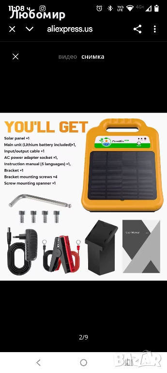 Слънчев панел *1, хост (включително литиева батерия) *1, I/O кабел *1, захранващ контакт *1, ръководство за употреба *1, скоба *1, винт за монтаж на скобата *4 и гаечен ключ за монтаж на винтове *1.