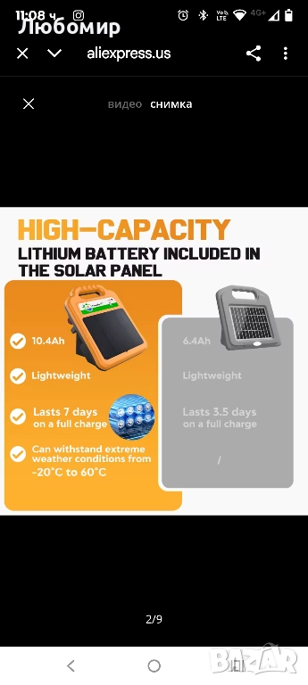 Режим на захранване: 4.3W соларен панел захранва литиево-йонната батерия/AC контакта (захранването може да се осигури от контакта на стената, когато литиевата батерия е включена, а AC щепселът може да се превключи на DC с кръглия отвор).