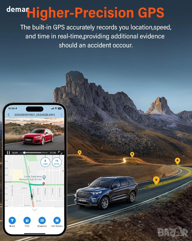 видеорегистратор предлага ясен 4K преден и 1080p заден запис със силно нощно виждане и WDR за ясни кадри при всякакви условия на осветление. Разполага с вграден GPS за точно проследяване на маршрут, скорост и времеви отпечатъци, плюс Wi-Fi и приложение за лесен достъп до видео, споделяне и актуализации. Предварително инсталирана 64GB карта, цикличен запис, G-сензор, аварийно заключване, суперкондензатор и дисплей за скорост/посока, базиран на приложение, повишават надеждността и безопасността, докато усъвършенстваният режим за паркиране осигурява непрекъсната защита, когато е свързан с хардуерен комплект.
