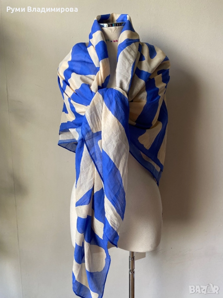 Бял/ син шал Soleil Soleil от 100 % органик памук, с етикет → Обява 52533920