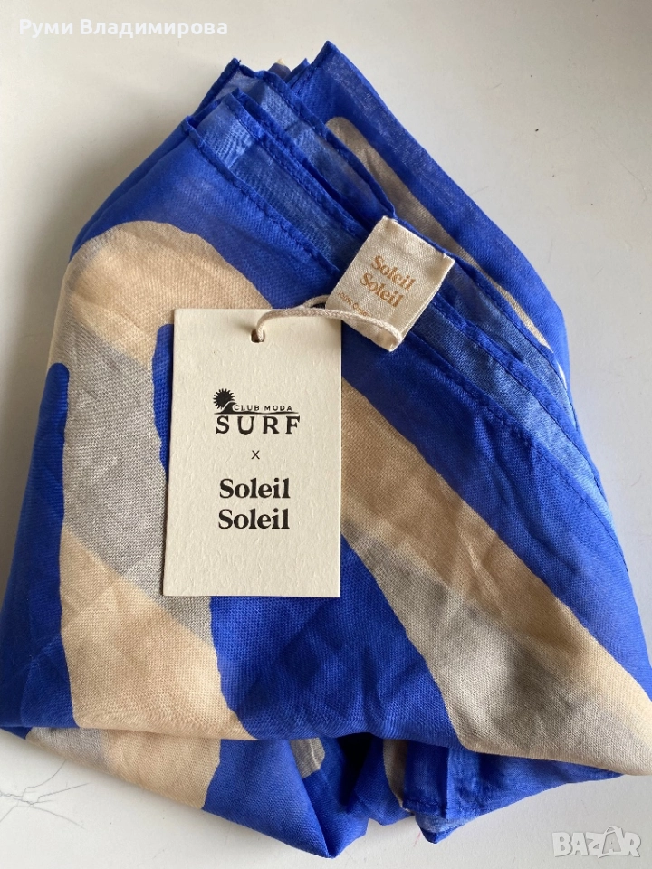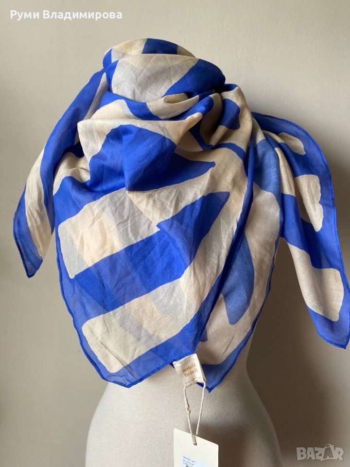 Бял шал със сини акценти от 100 % органик памук, с етикет, Soleil Soleil австралийски бранд, летен шал на етикета е записано квадратно парео, цена на шал в онлайн магазин на марката от 120 лв нагоре, доставка с Еконт.