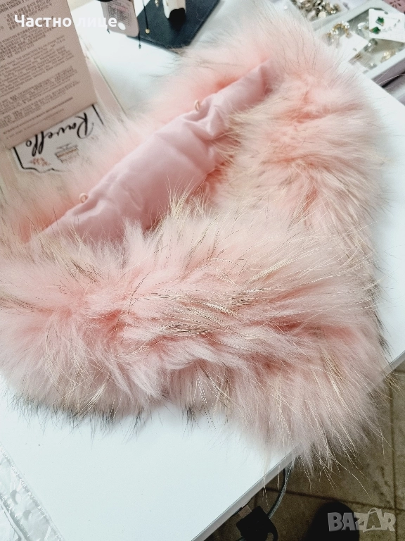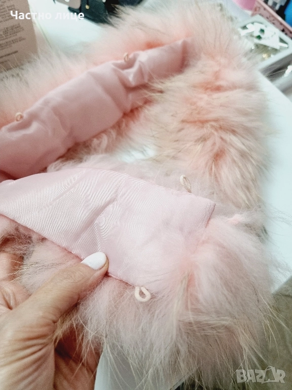 Естествена яка от косъм на ракун в цвят розово. Идеална за добавяне на стил и усещане за лукс към всяко облекло.