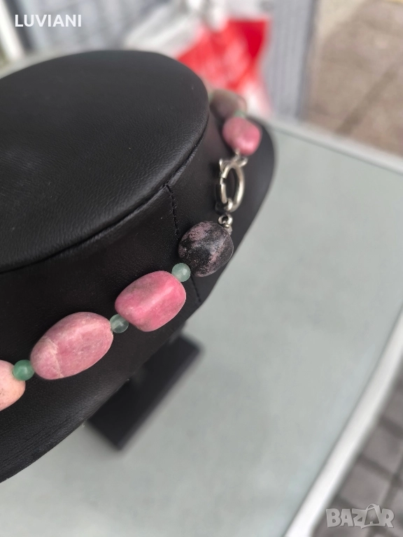 Късовете са подредени в хармонична композиция, балансираща техния размер и оттенъци. Повърхността им е леко загладена, запазвайки естествената им красота. Колие­то завършва със светла метална закопчалка — сребриста или платинена — която нежно допълва розовите тонове.