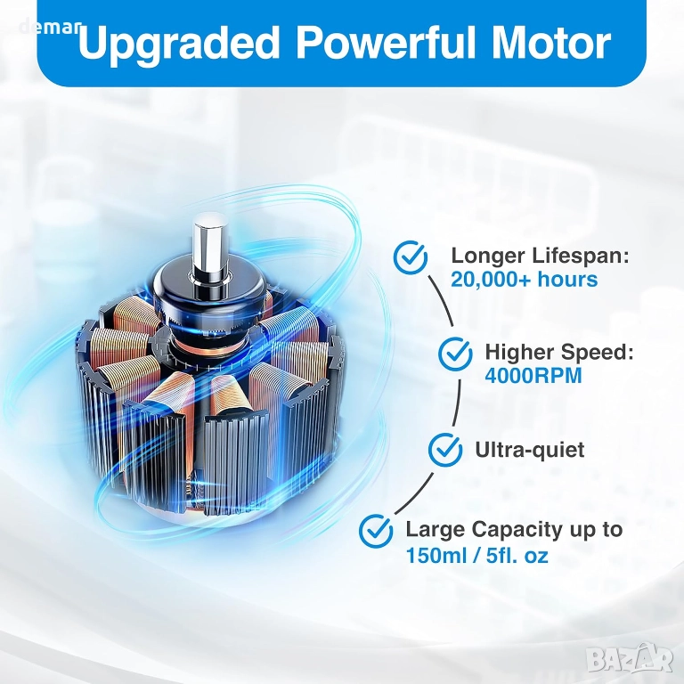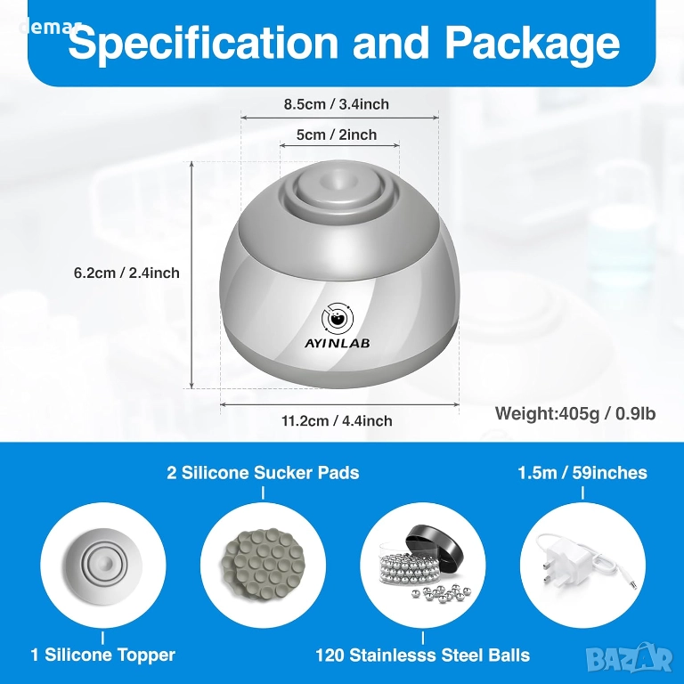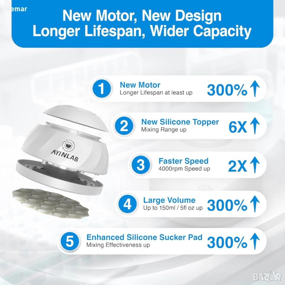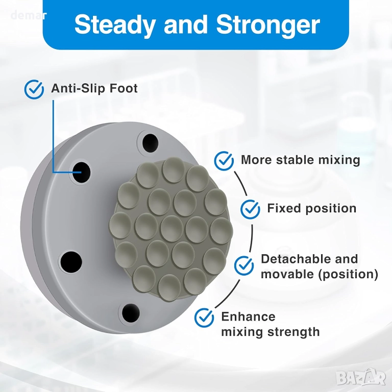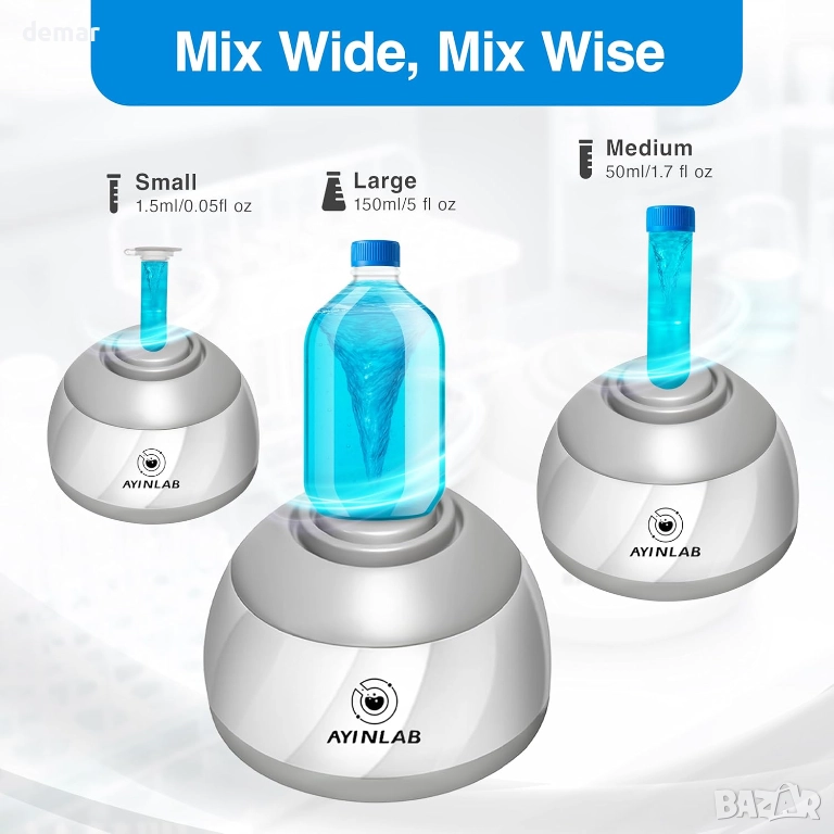 Този миксер разполага с дълготраен безчетков мотор, широк силиконов накрайник против хлъзгане за стабилно смесване и подсилени вендузи за допълнителна безопасност. Той осигурява бърза производителност от 4000 оборота в минута и поддържа широк диапазон от размери на контейнери. Неговата тиха и ефективна работа е съчетана с лесно управление с докосване за смесване и се предлага с допълнителни аксесоари за постоянна употреба. Подходящ за лаборатории, класни стаи, медицински заведения и разнообразие от креативни или „Направи си сам“ течности като гелове, мастила, смоли, бои, пигменти, масла и други.