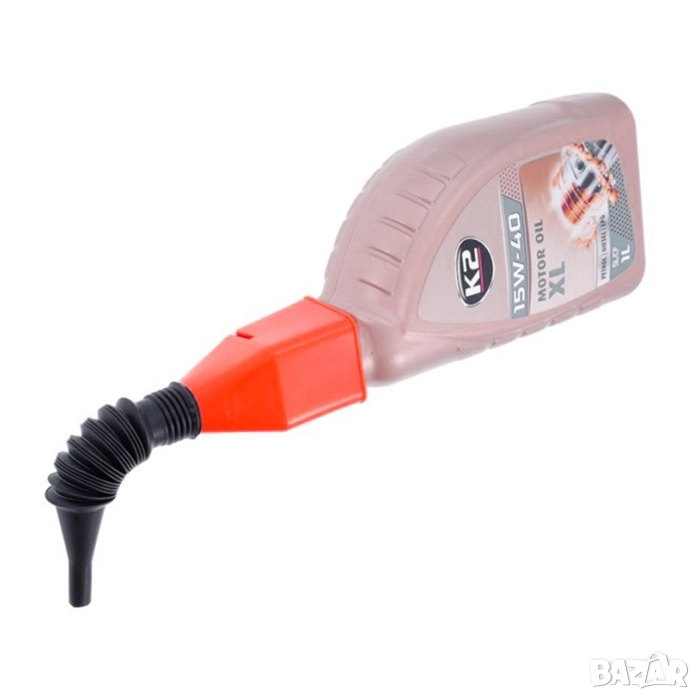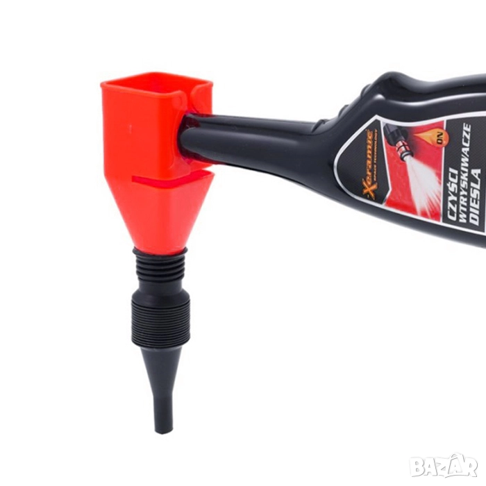 Практична и универсална фуния за наливане на течности, оборудвана с разтегателно маркуче, което се огъва и чупи в различни посоки за лесен достъп до труднодостъпни резервоари и отвори. Конструкцията ѝ включва допълнителни отвори отстрани и отгоре, които осигуряват вентилация и удобство при работа, като предотвратяват преливане.