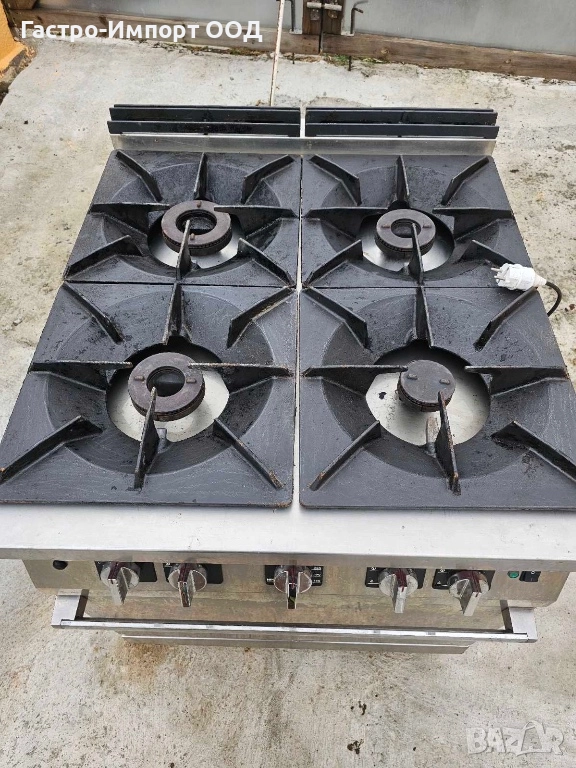 Изработен от неръждаема стомана. 3 броя горелки с диаметър Ø110 мм х 8kW и 1 брой Ø80 мм x 6kW, поставени чугунена основа.