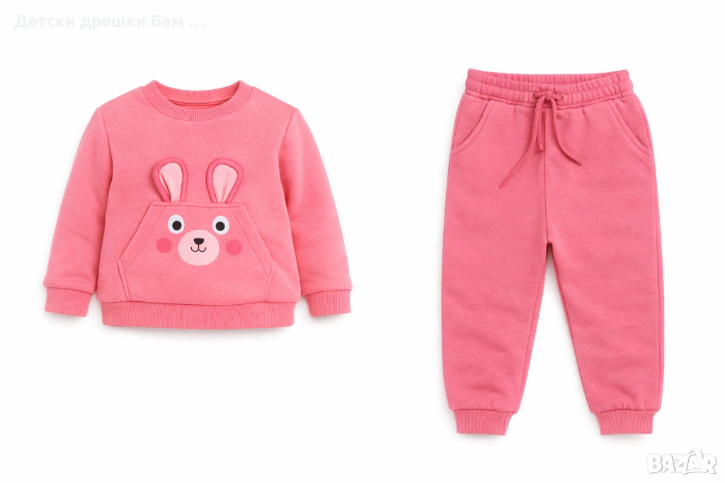 Изключително мек, удобен и топъл комплект, състоящ се от блузка с апликация „зайче“ и долнище с ластик.