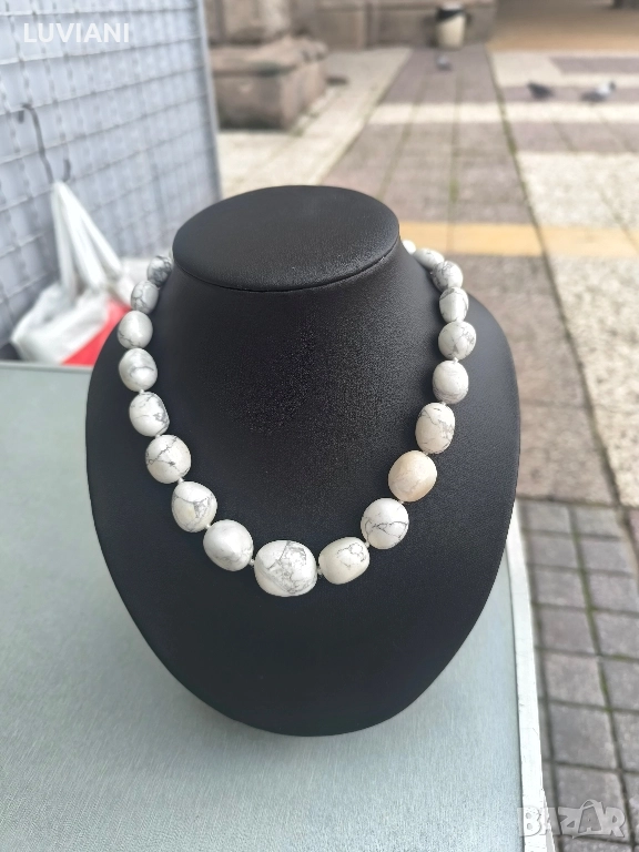 Това изящно колие е изработено от големи, естествени късове бял тюркоаз, чиято нежна мраморна структура придава усещане за чистота и спокойствие. Всеки камък е уникален по форма и шарка, което превръща всяко колие в неповторимо бижу с характер и присъствие.