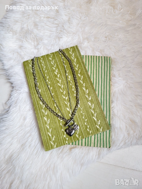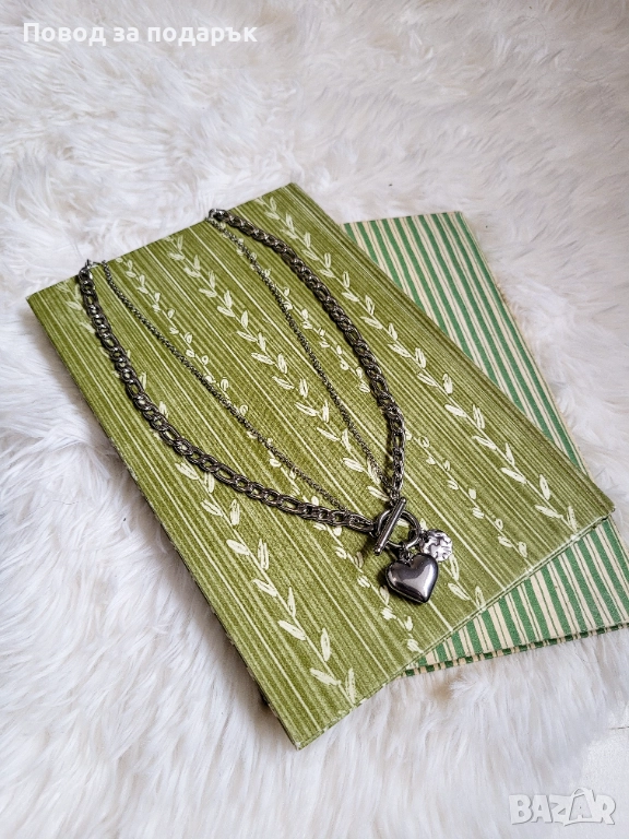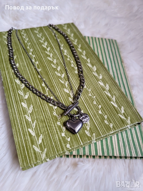 Дизайнът съчетава две различни верижки и висулки, които създават интересен контраст, а T-bar елементът отпред е не просто закопчалка, а основен акцент, който прави визията супер модерна и добавя характер и стил.