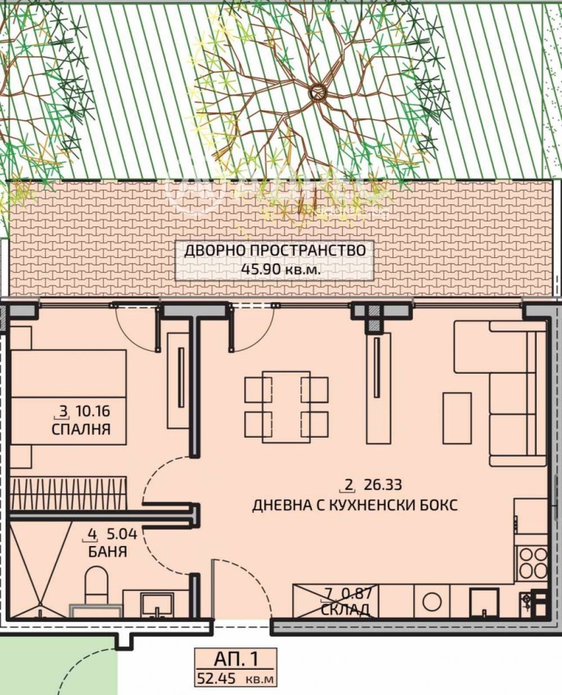 Двустаен партерен апартамент 61 кв.м., със собствен двор 46 кв.м., със следното разпределение: хол с кухненски бокс 26 кв.м., спалня, баня с тоалетна. С усещане за малка кокетна къща.