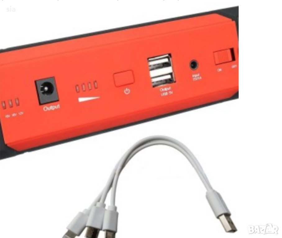 Мултифункционално стартерно/зарядно устройство с 2 USB порта за зареждане на различни електронни устройства и лед фенер с аварийни светлини.