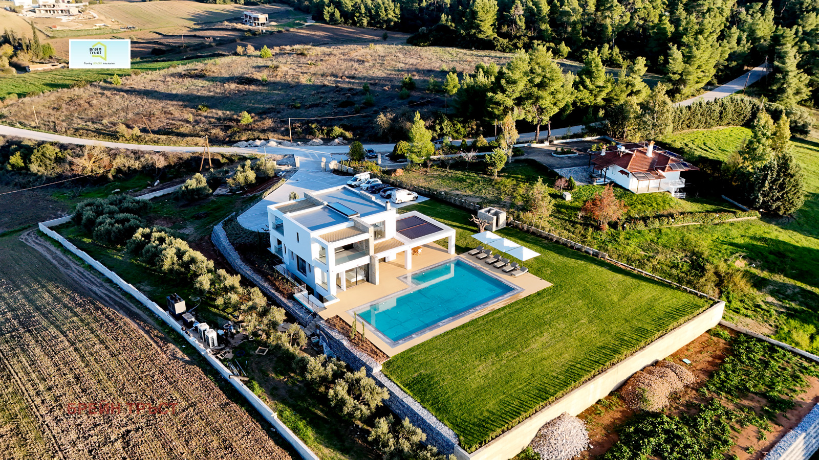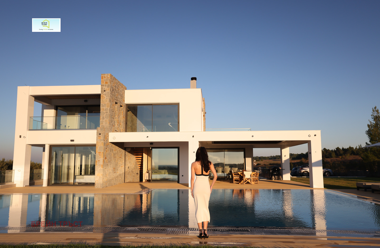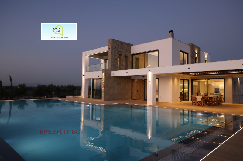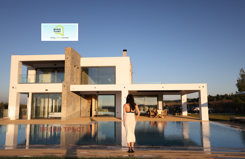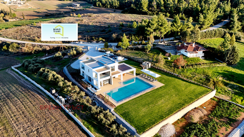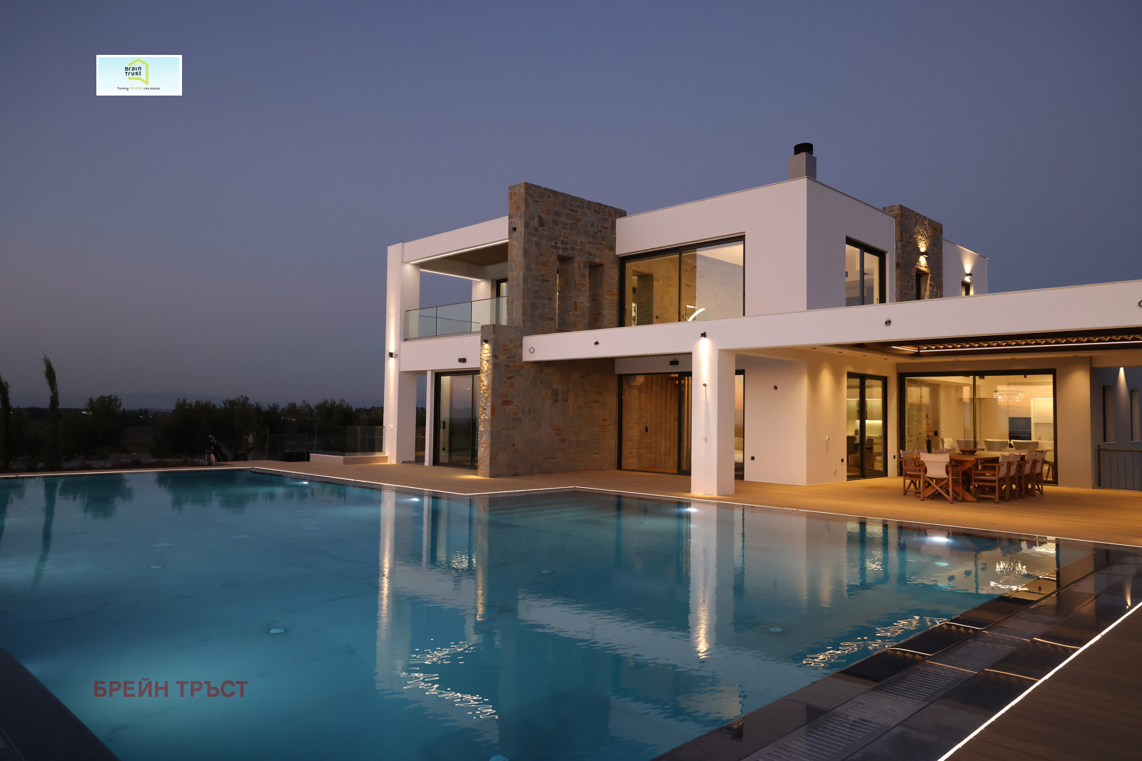 Brain Trust Ви предлага луксозна къща от 500 кв.м., разположена на две нива (сутерен и партер), върху просторен парцел от 5000 кв.м. в Касандра. Резиденцията разполага със седем главни спални, осем бани, една тоалетна, две кухни и три дневни. Осигурява осем външни паркоместа. Построена през 2025 г., имотът предлага енергийна ефективност от най-висок клас (A+) с автономно отопление чрез термопомпа, регулиране на отоплението ниво по ниво, климатизация, топлоизолация и звукоизолация. Оборудвана е с алуминиеви рамки и дървени подове. Вилата е в изключително състояние и се радва на открита гледка към морето, планините и околната зеленина. Светла, елегантна и прясно боядисана, тя предлага изискано жилищно изживяване. Допълнителните екстри включват енергийно ефективна камина, складово помещение, вътрешно стълбище, частен басейн, озеленена градина, охранителна врата, видеодомофон, алармена система, видеонаблюдение, противопожарна система, пожарогасители, сателитна връзка, морава, зрели дървета и частен сондажен кладенец.