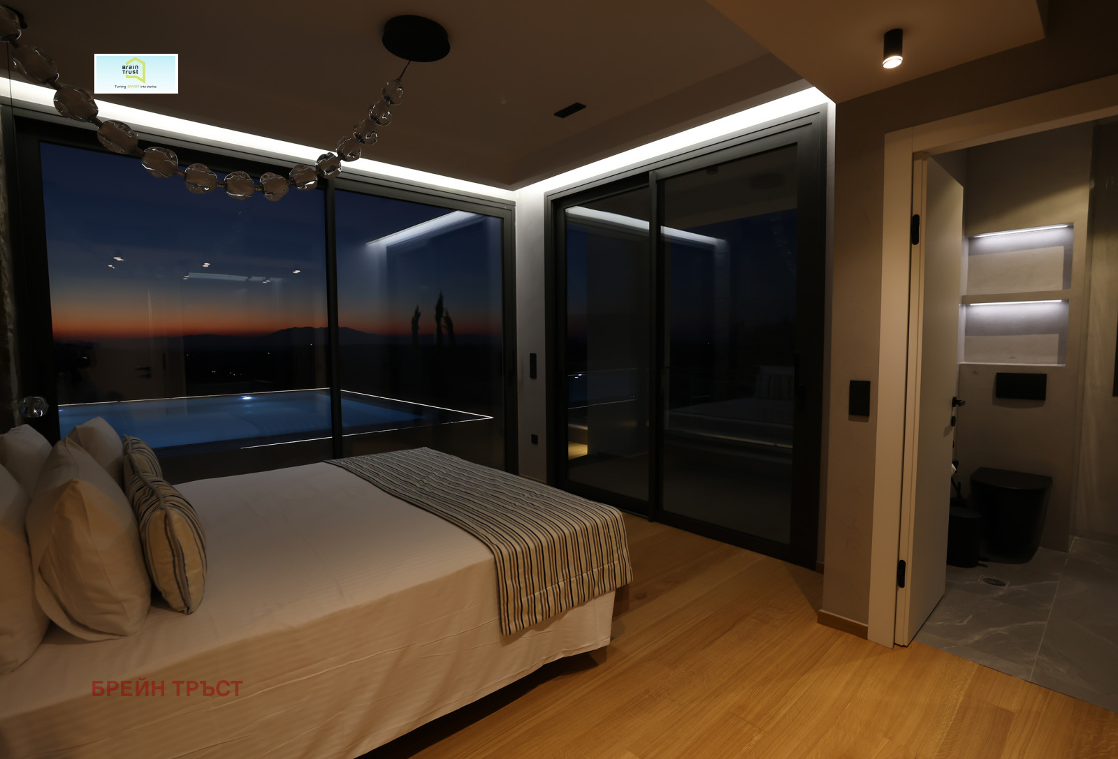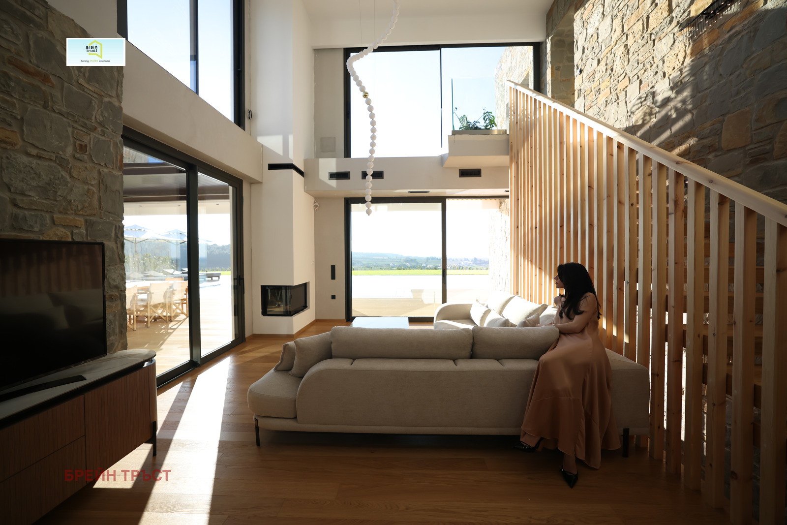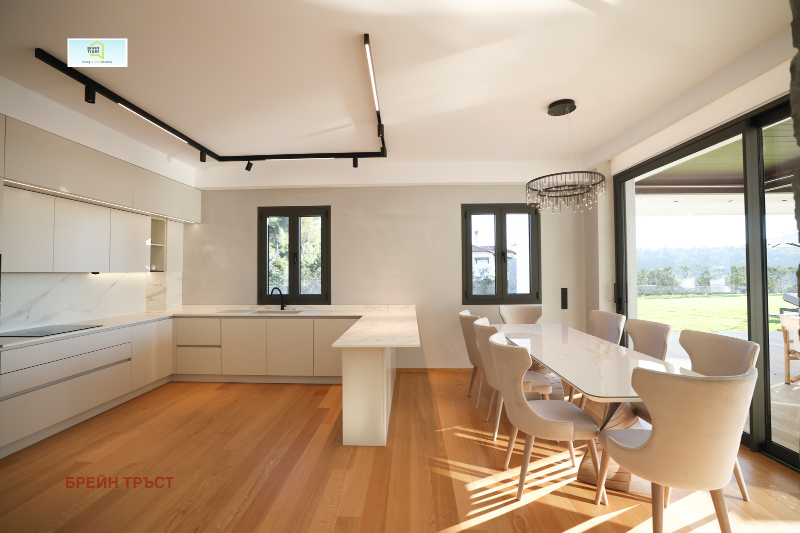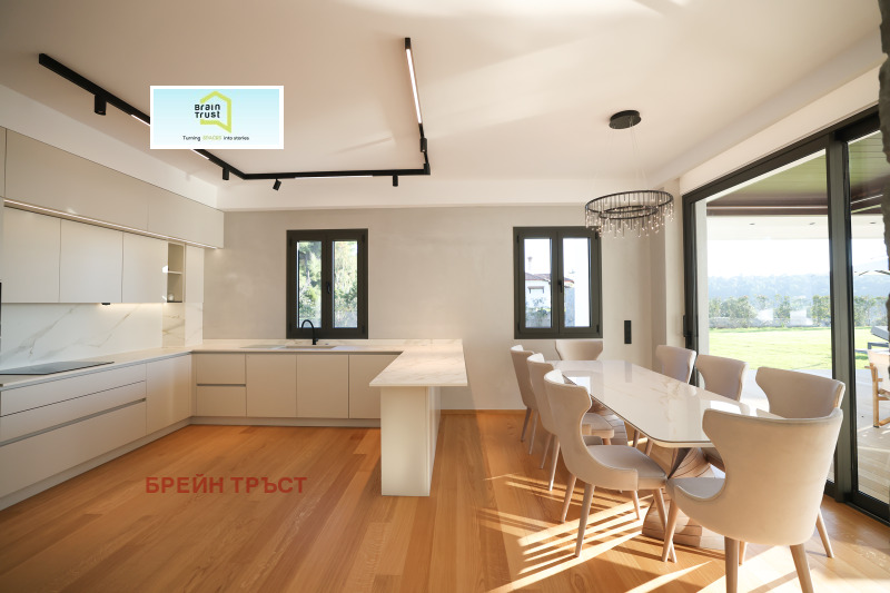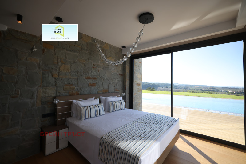 Brain Trust Ви предлага луксозна къща от 500 кв.м., разположена на две нива (сутерен и партер), върху просторен парцел от 5000 кв.м. в Касандра. Резиденцията разполага със седем главни спални, осем бани, една тоалетна, две кухни и три дневни. Осигурява осем външни паркоместа. Построена през 2025 г., имотът предлага енергийна ефективност от най-висок клас (A+) с автономно отопление чрез термопомпа, регулиране на отоплението ниво по ниво, климатизация, топлоизолация и звукоизолация. Оборудвана е с алуминиеви рамки и дървени подове. Вилата е в изключително състояние и се радва на открита гледка към морето, планините и околната зеленина. Светла, елегантна и прясно боядисана, тя предлага изискано жилищно изживяване. Допълнителните екстри включват енергийно ефективна камина, складово помещение, вътрешно стълбище, частен басейн, озеленена градина, охранителна врата, видеодомофон, алармена система, видеонаблюдение, противопожарна система, пожарогасители, сателитна връзка, морава, зрели дървета и частен сондажен кладенец.