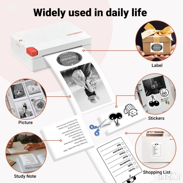 Универсални персонализирани стикери: Принтерът за фотостикери включва 1 ролка термохартия 80 мм × 3 м (не е необходимо мастило!). Изрежете свободно разпечатките в етикети, стикери или форми за дневници, списъци за пазаруване, планери, етикети за подаръци или училищни проекти - безкрайна креативност.