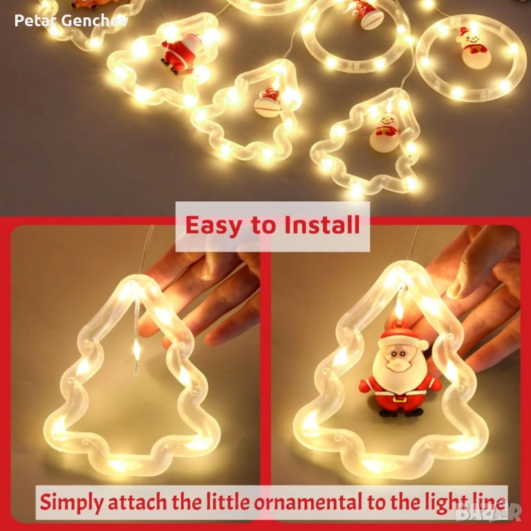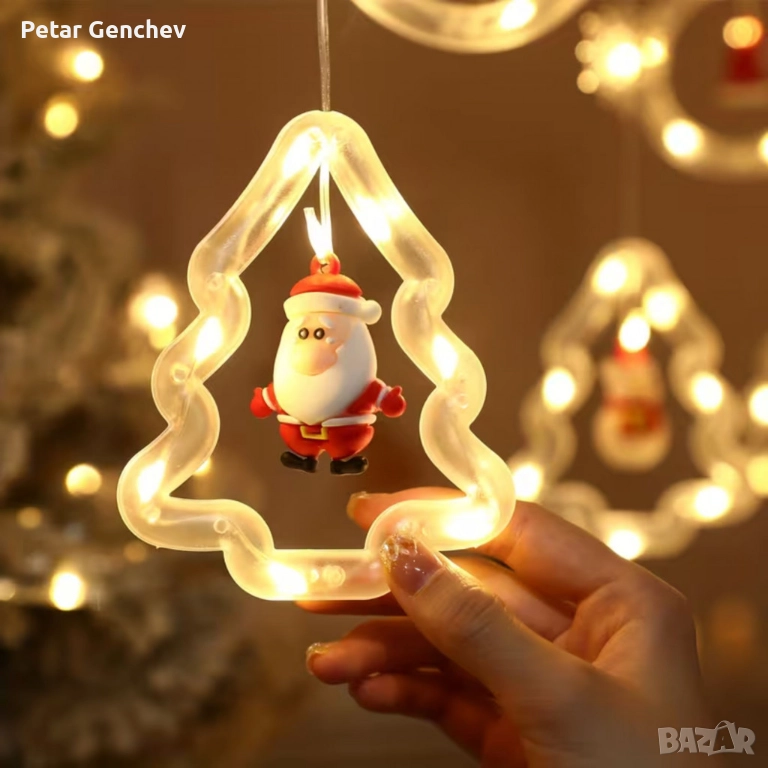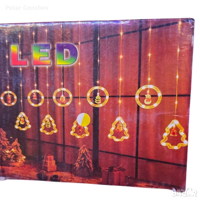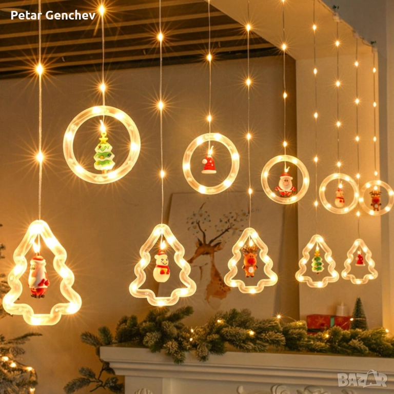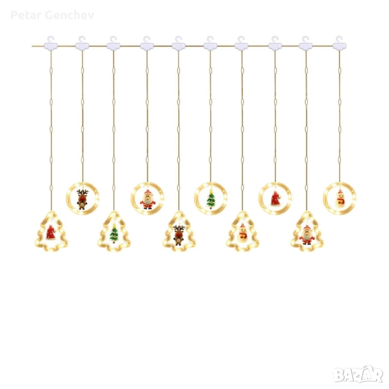 Светещ коледен гирлянд с рингове и малки коледни фигурки / 5 броя коледни елхи и 5 броя рингове с иг → Обява 52540319