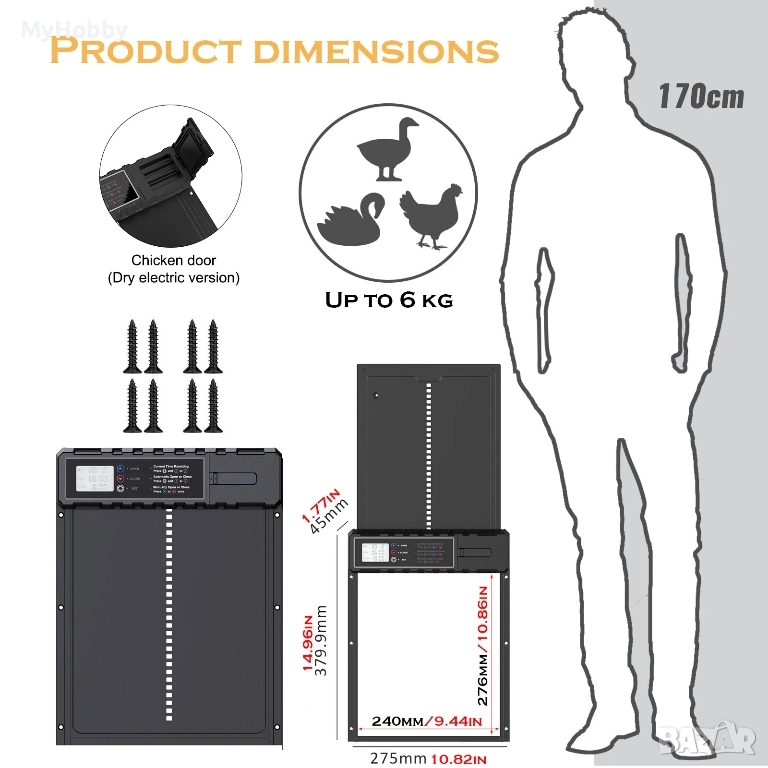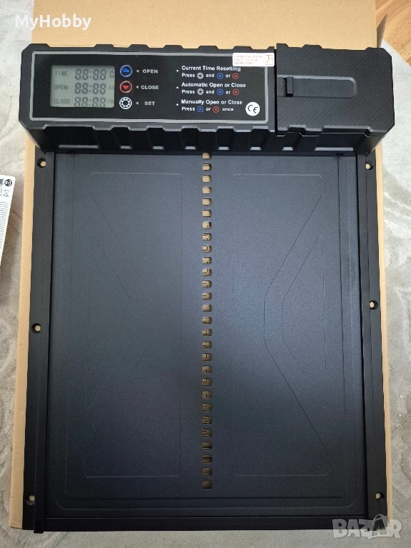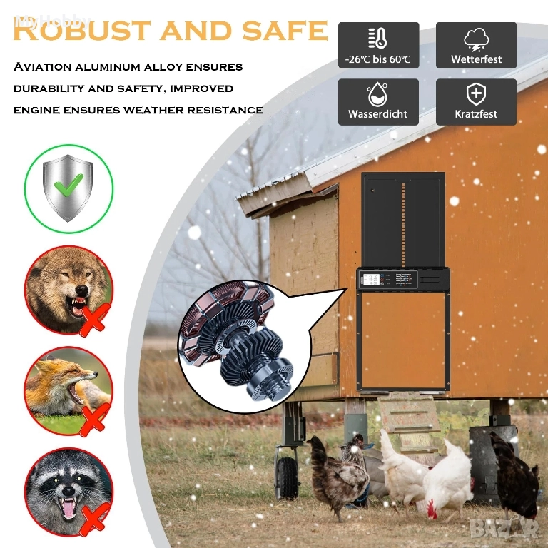 алуминиева Автоматична врата XL с таймер за кокошарник: Два гъвкави режима: ръчно управление или настройка на таймер. Таймерът може да бъде настроен прецизно, като машината автоматично отваря вратата сутрин и я затваря автоматично вечер. 24-часовият LED дисплей с таймер ви позволява свободно да персонализирате времето за отваряне и затваряне на вратата всеки ден, което ви позволява да се наслаждавате свободно на сутрините и вечерите си.Размер на вратата височина 38см ширина 27,5см Подходяща за по-едри пернати (Петли,кокошки,гъски,пуйки или патици) тегло до 6-7 кг Висококачествени материали: устойчиви на корозия, ветроустойчиви, водоустойчиви и оборудвани с най-съвременна технология, за да осигурят най-добрата защита на вашите пилета.