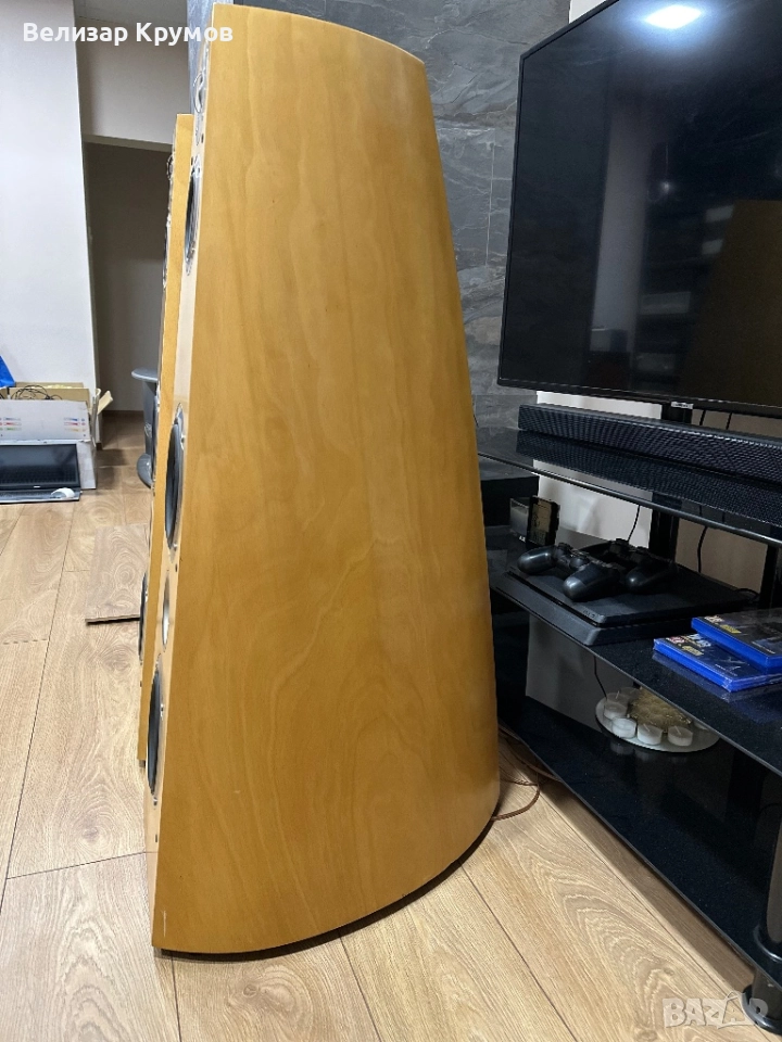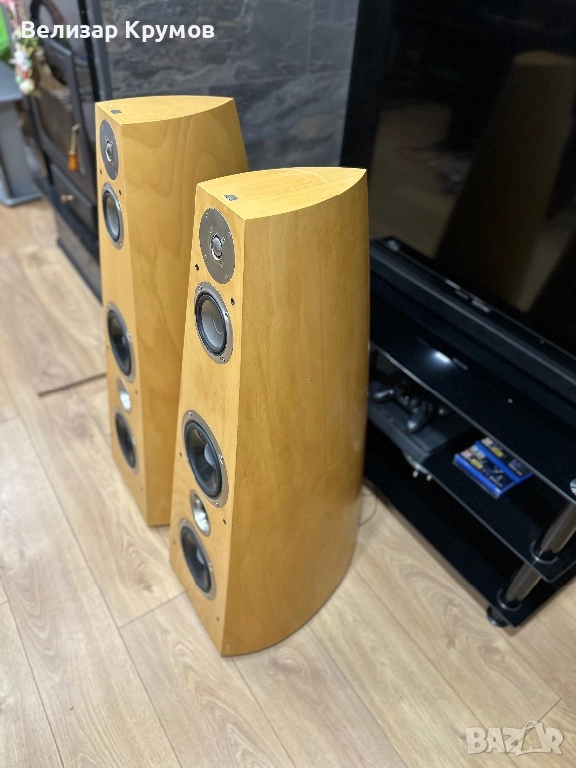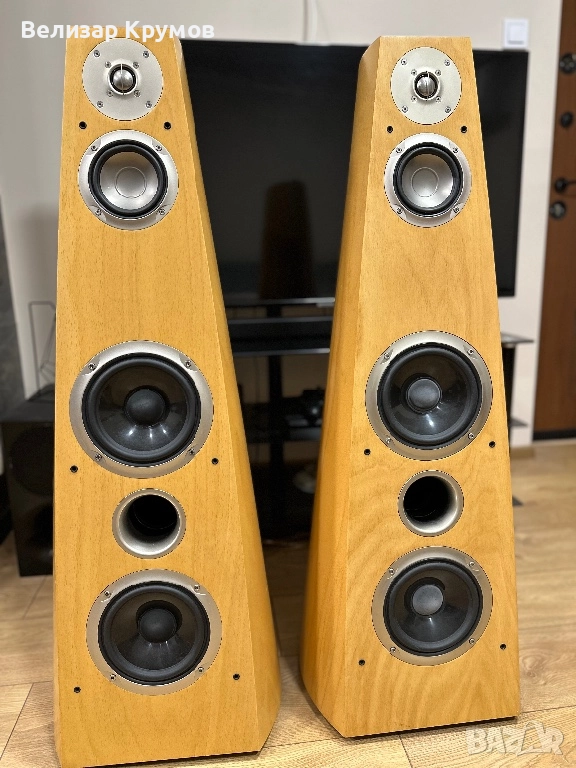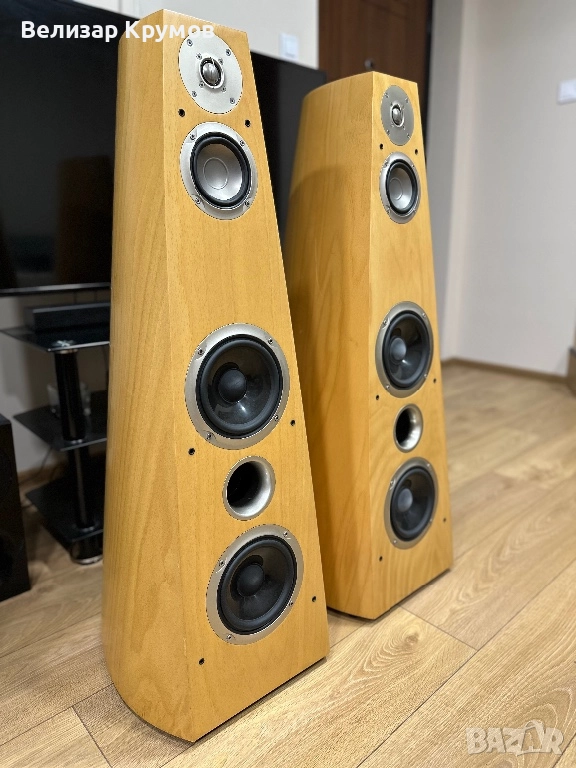 Тонколоните са в много добро визуално състояние,звучат много ясно и детайлно.Размерите им са 1100 x 380 x 530 mm,34 килограма е една