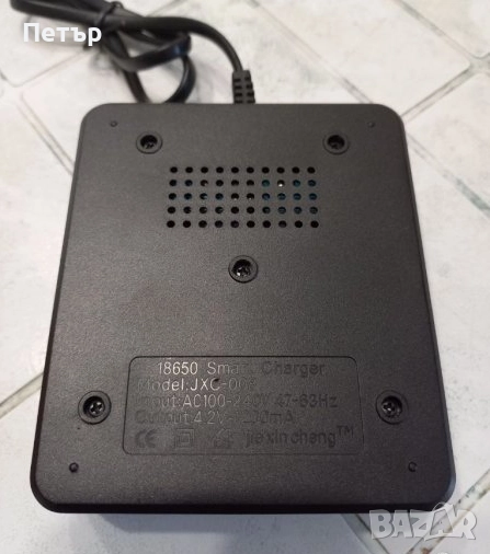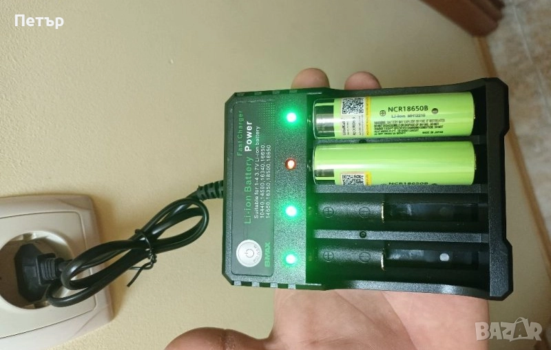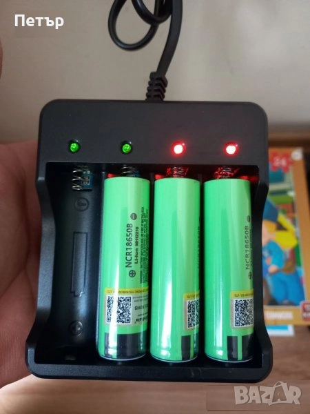 3. Зарядно устройство за 4бр презареждащи батерии 18650. Зарядното има 4 броя светлинни индикатори, които по време на зареждането светят в червено, показва и вече заредените батерии, като светят в зелено. Може да се зарежда и само по една батерия. Зарежда по 1200mА/h. Снимки 5, 6, 7 и 8.