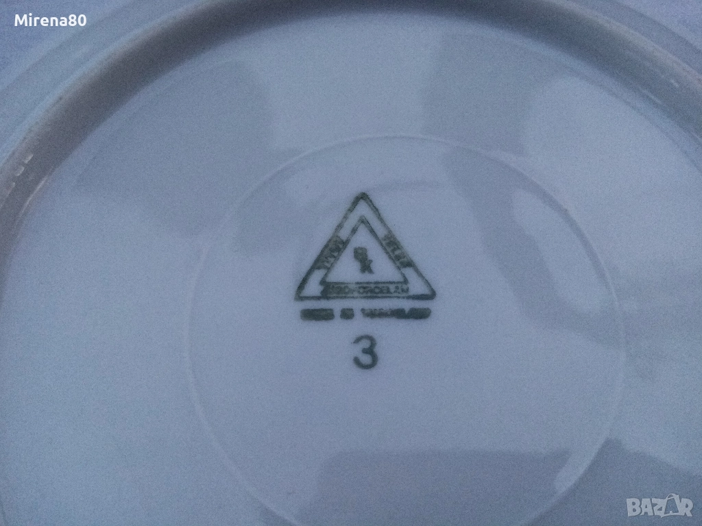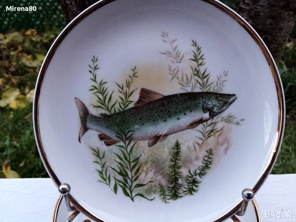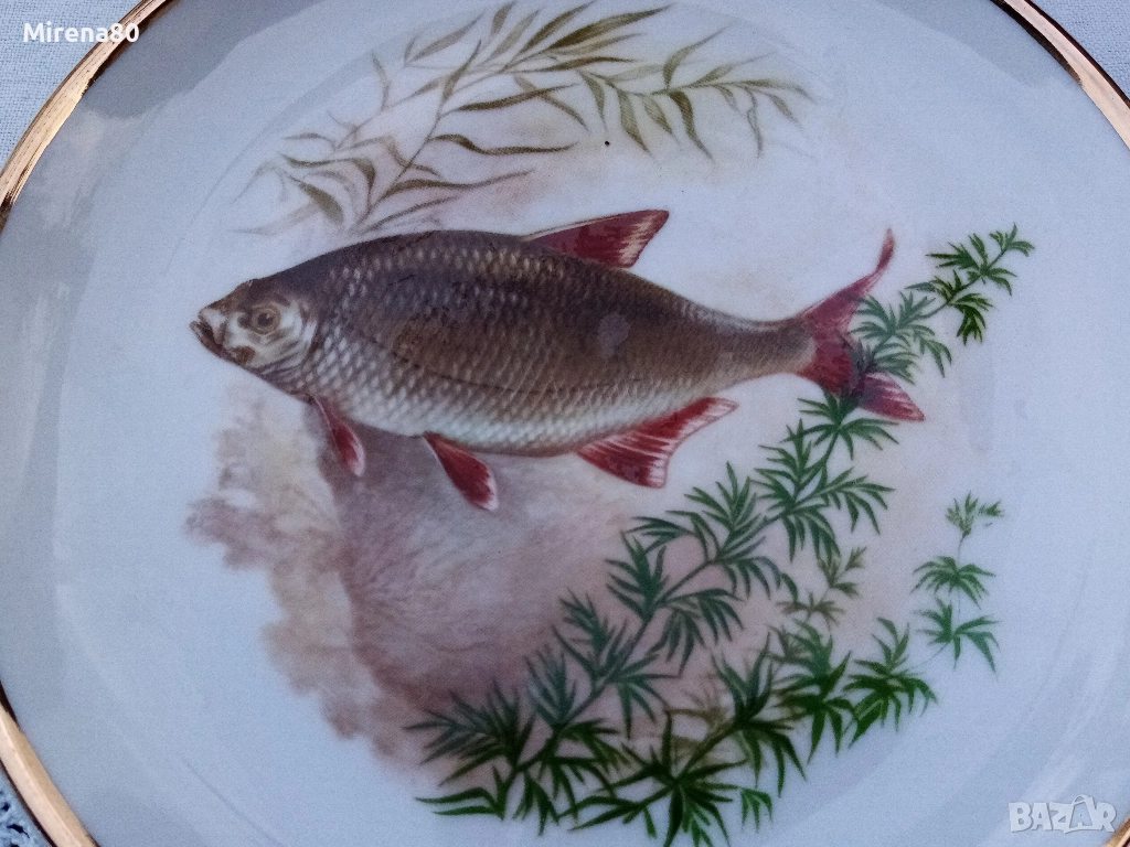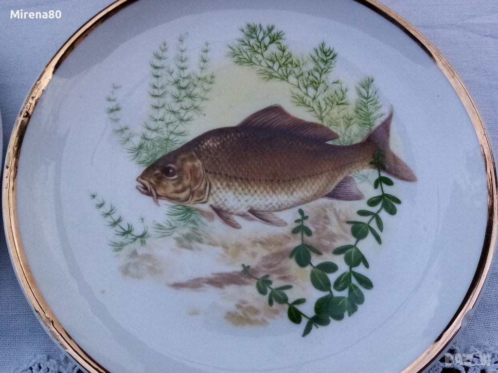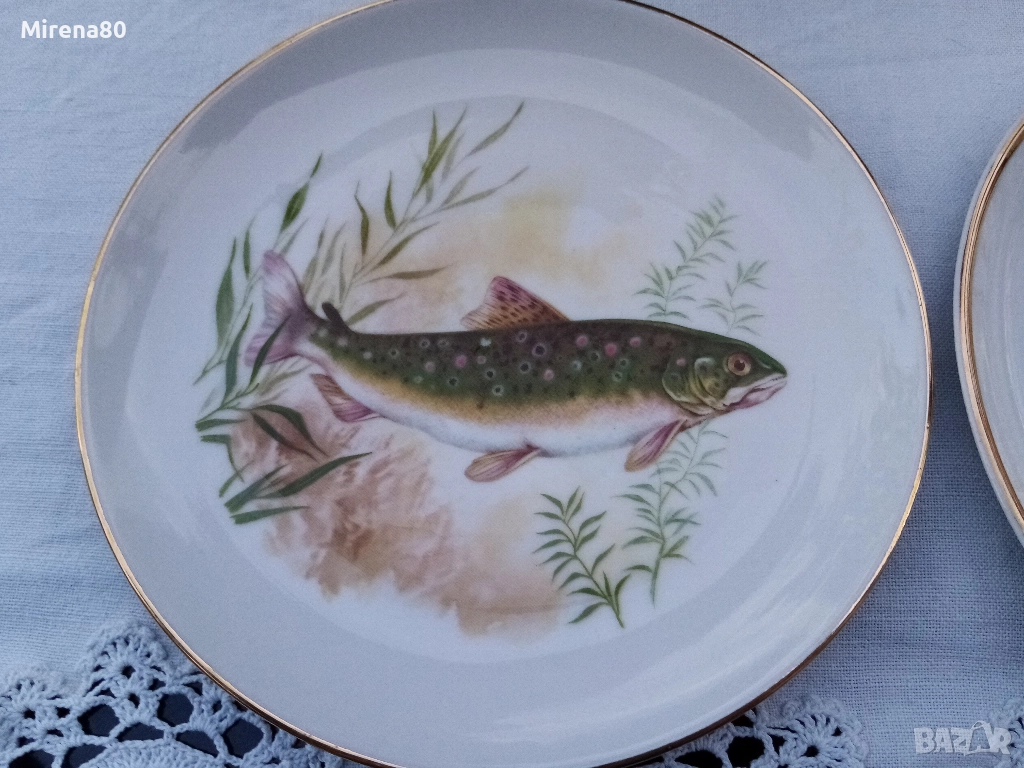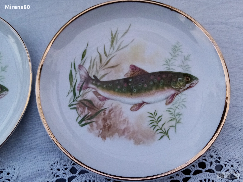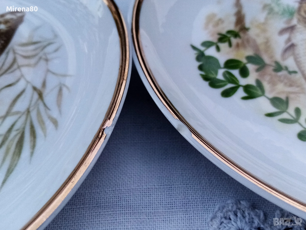 6 красиви чинии с рибен декор от бивша Югославия. Фин, лек порцелан, златен кант. 2 от рибите са еднакви. 17.5 см диаметър.Две чинии имат минимални забележки - едната е с фабрично прекъсване на златния кант (0.5 см), а другата има малко чипче - вижте посл. снимка.