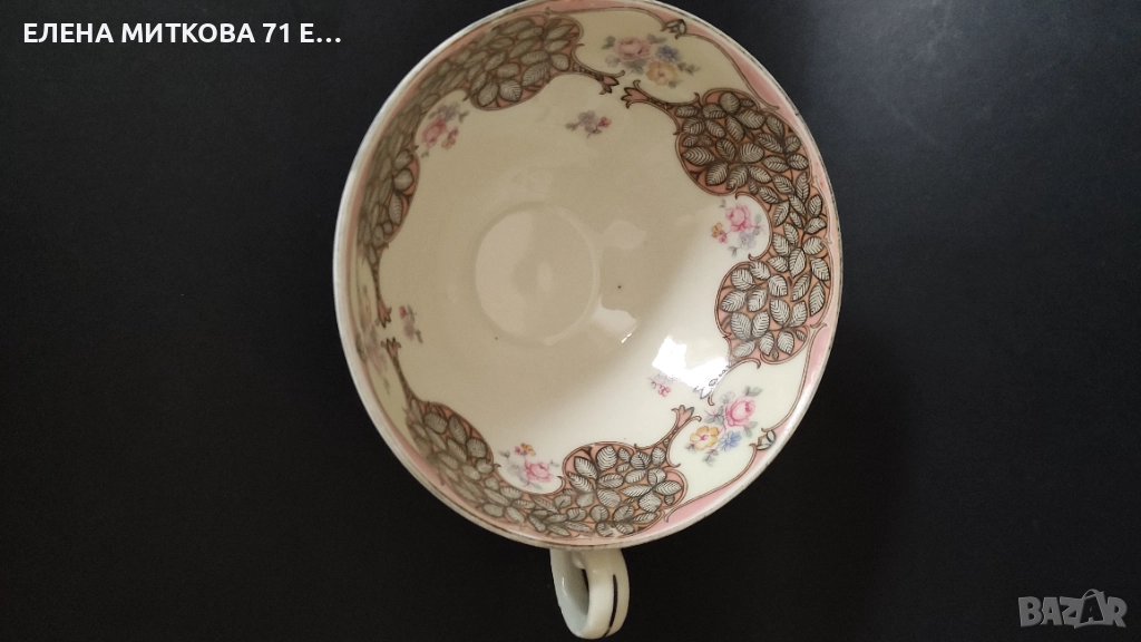Изключително рядък декор паунови пера в кафяво и розово и нежни цветчета ,ръчно нанесен върху порцелан в кремав цвят