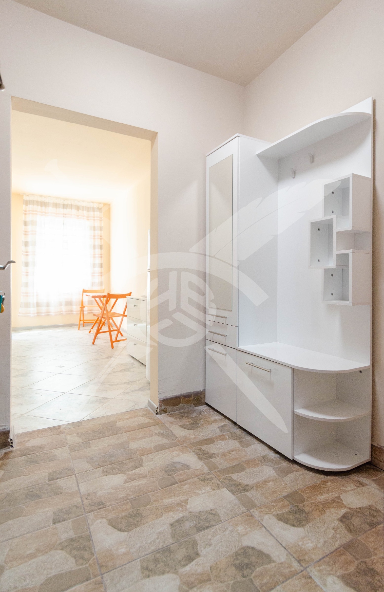 РАЗПРЕДЕЛЕНИЕ: Жилището разполага с площ от 40 кв.м., разпределена във входно антре, еднопространствено помещение разделено на кътове, тераса, баня и тоалетна.