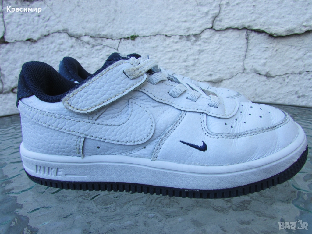 Детски маратонки Nike Force 1 Low LV8 със система EasyOn. Изработени са от кожена горна част, с перфорирани отвори в предната част за максимална вентилация. Лесно се обуват и събуват, благодарение на еластичните връзки и слепката отстрани за фиксиране. В междинната подметка е вложено повече пяна от стандартното, за повече комфорт и мекота, а гумената подметка е с кръгла шарка на протектора за по - добро сцепление. Номер 31,5 с дължина на подметката 19,5 см. Произведени в Индия.