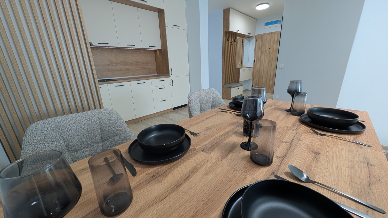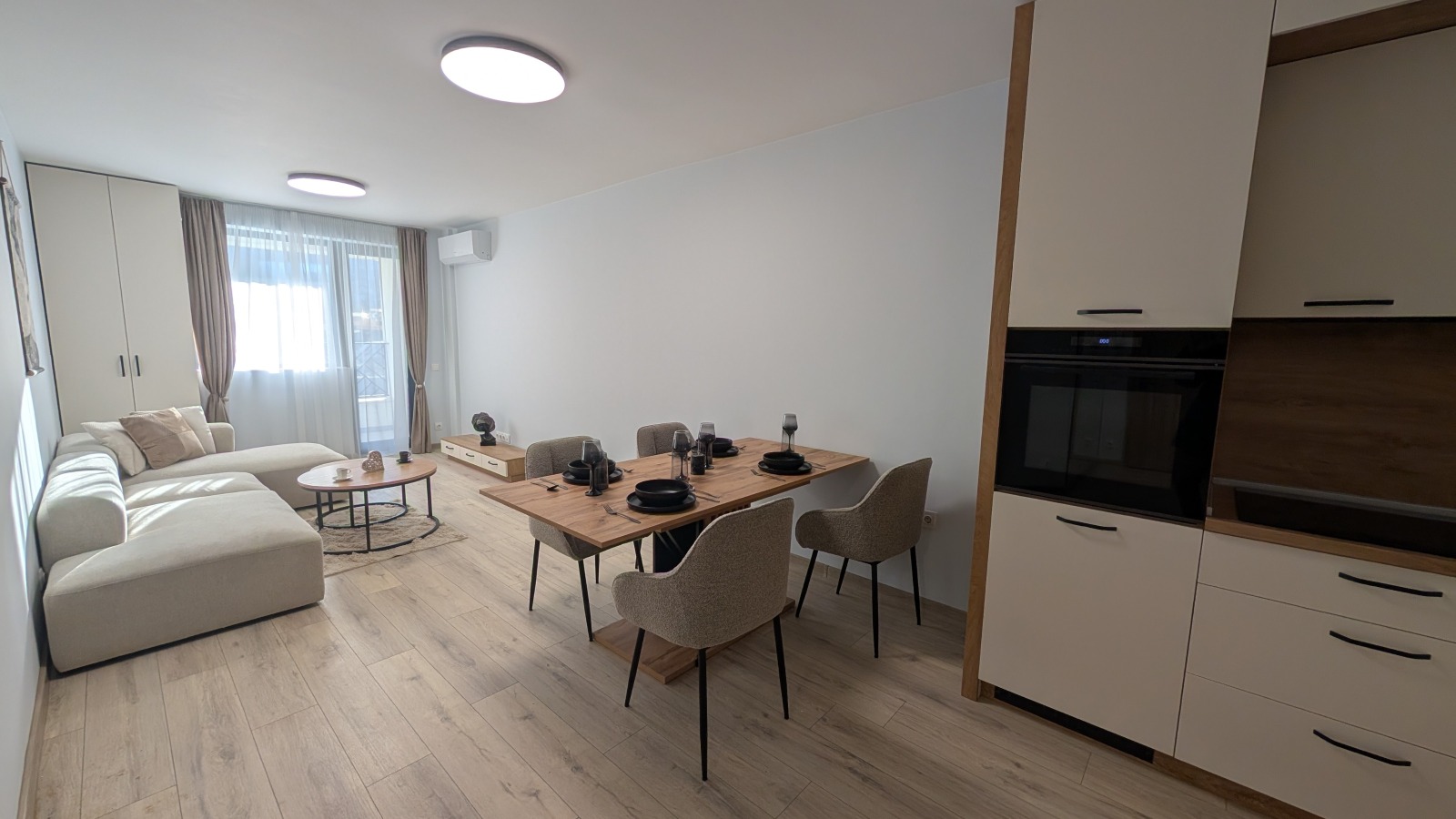 Представяме Ви елегантен и напълно завършен тристаен апартамент, разположен на втори етаж в нова сграда, въведена в експлоатация през 2025 г. (Акт 16). Имотът впечатлява с модерен интериор, подбрани материали, простор и много естествена светлина.