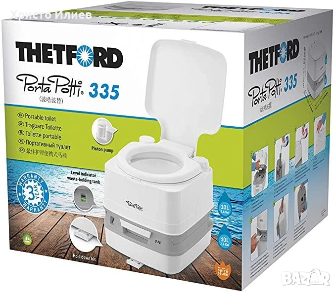 Химическа тоалетна Porta Potti 335 е мобилна и лесна за пренасяне. Тя има капацитет за промивна вода от 10 литра и капацитет за отпадъци от 10 литра. Класифицирана е като удобна за употреба с комфорт от 4/5. Тоалетната е снабдена с бутална помпа за промиване, която е лесна за управление. Няма дисплей за индикатор за нивото на резервоара за промивна вода, но има индикатор за нивото на резервоара за отпадъци. Тоалетната може да бъде прикрепена към приставка за под, която се купува отделно. Размерите на тоалетната са 313 x 342 x 382 мм, а нейното нетно тегло е 3,3 кг. Височината на седалката е 308 мм, което я прави по-малка от другите модели и удобна за употреба и от деца.