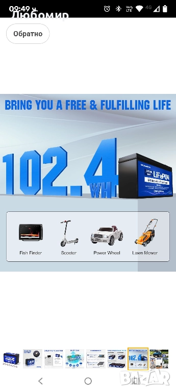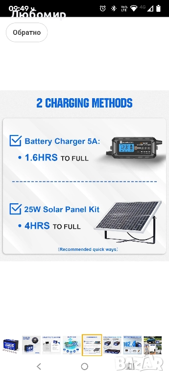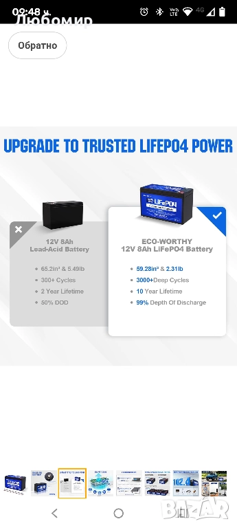 1/3 Лекота: Литиево-киселинната батерия с капацитет 8Ah тежи само 2,31 паунда (1,05 кг), което е само 1/3 от теглото на оловно-киселинна батерия. Размери 6"*3,8"*2,6" (152*96*65 мм), лесна за преместване и монтаж. В комплекта са включени и 2 кабела за зареждане на батерията с F2 конектор.