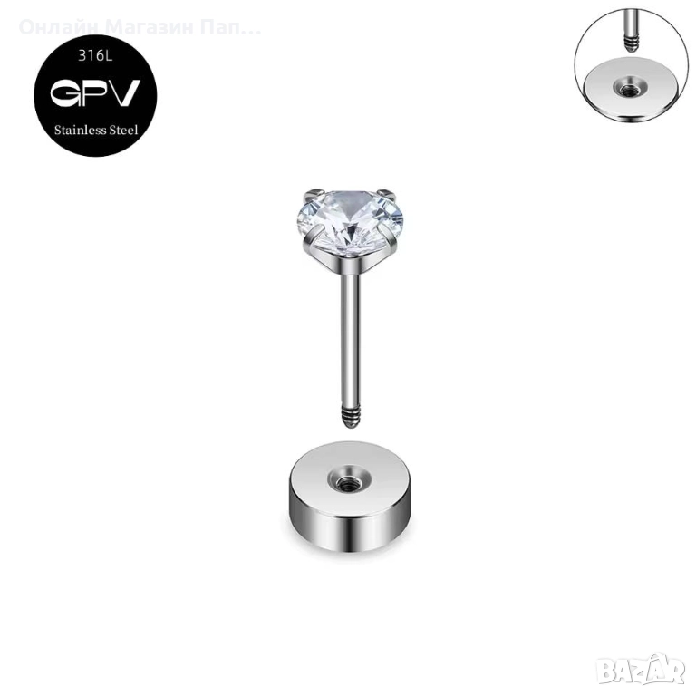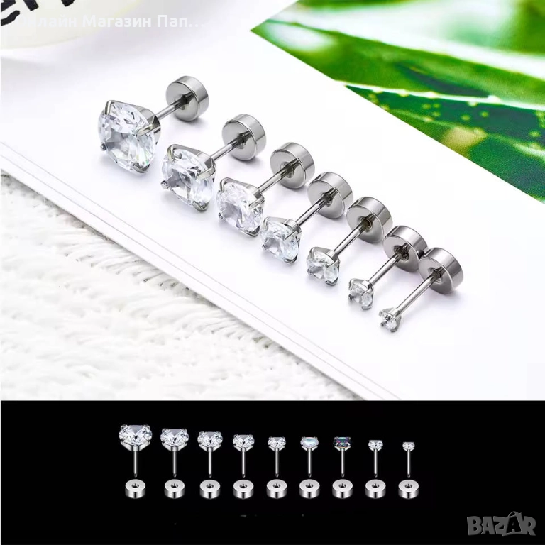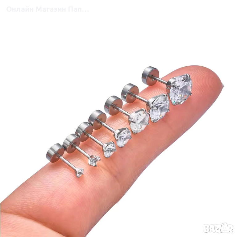 Основен камък: Бял цирконий (CZ), размери: 2 / 3 / 4 / 5 / 6 / 7 / 8 мм