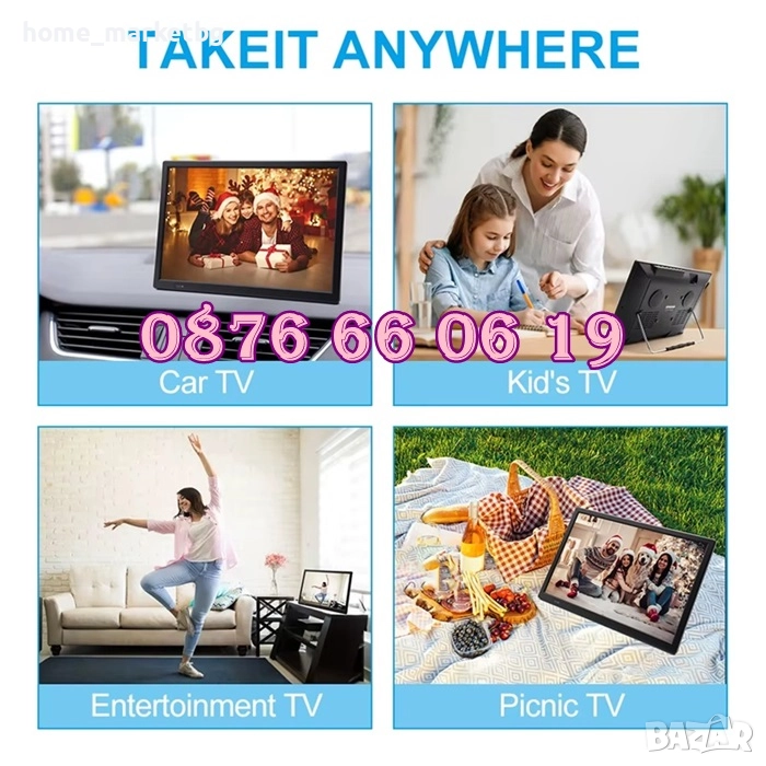 Портативен, лесно преносим Телевизор с цифров тунер и вградена акумулаторна батерия за автономна работа. Подходящ за използване при излет, в каравана, камион, кола, автобус и др. Мултимедийни функции - можете да гледате филми, клипове, да слушате музика и преглеждате снимки. AV вход за подаване на сигнал от външен източник, като DVD, сателитен, кабелен приемник, камера за задно виждане на кола, камион и др.