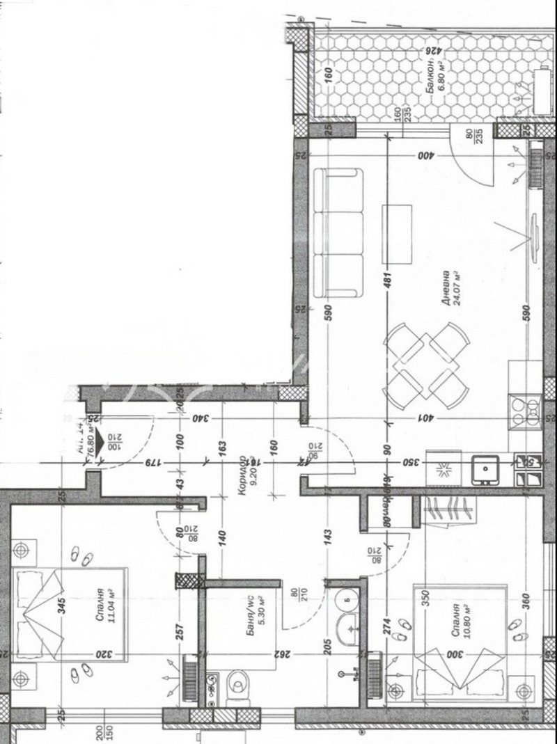 Имотът е с обща квадратура от 90м2 /застроена площ 76.8м2/ и е със следното разпределение - просторно антре 9.20м2, всекидневна с кухня 24.07м2, 2 спални 11.04м2 и 10.80м2, балкон 6.80м2 и санитарен възел 5.30м2.