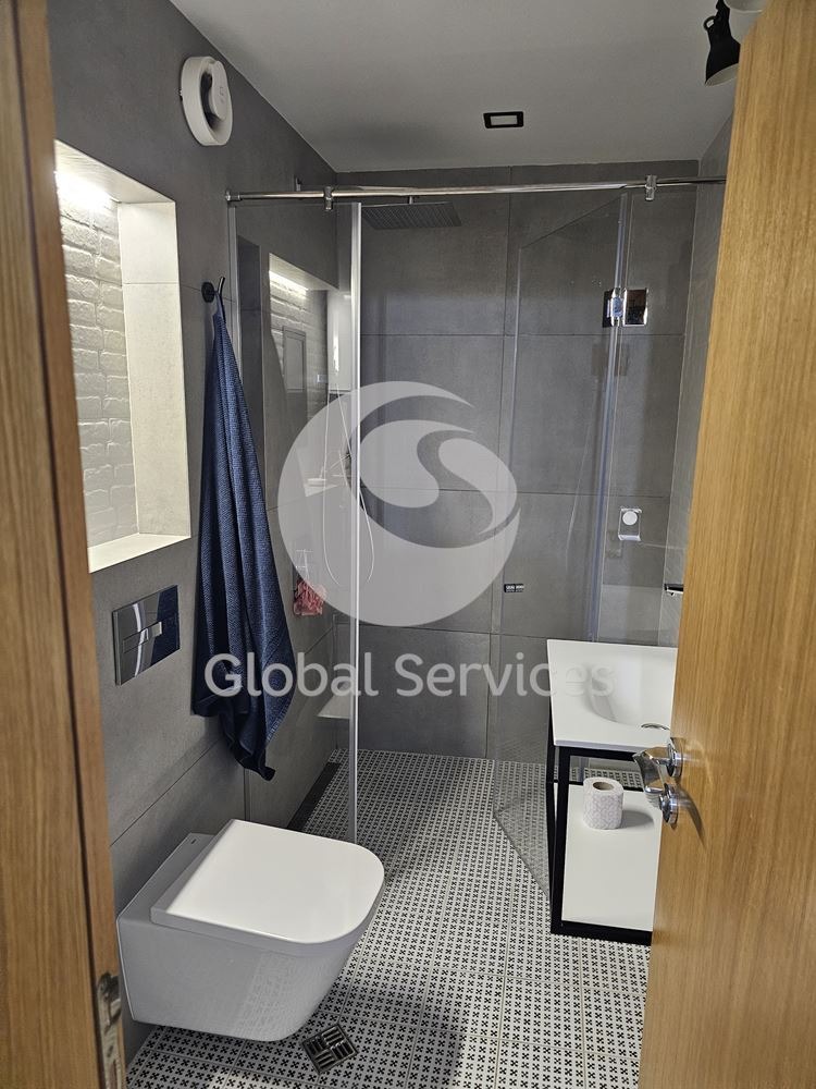 Разпределение: входно антре с вградени гардероби, уютна дневна обособена на зони- холна част, трапезария и вградена кухня с уреди , три спални всяка със самостоятелна баня с тоалетна , отделно тоалетна за гости и тераси около целия апартамент . Отоплението в спалните е с климатици ,а в останалата част е подово .