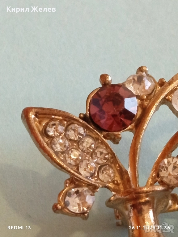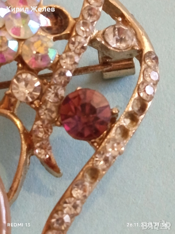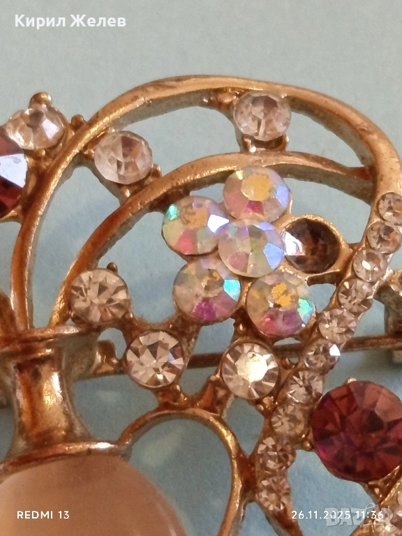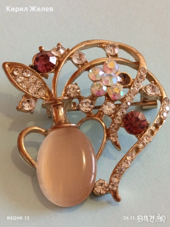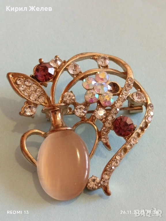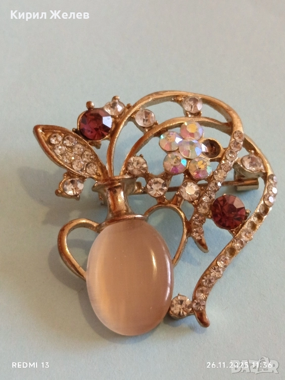 Винтидж брошка с флорален мотив украсен с кристали имитация на лунен камък 30638
