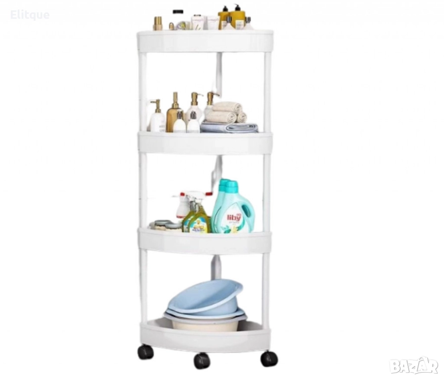 Модел: Corner Storage Rack; Височина: 84см; Материал: висококачествена пластмаса + метални тръби; Конструкция: ъглова, въртяща се на 360°, с универсални колелца; Нива: 4; Подходяща за: баня, кухня, хол, спалня; 21 cm → 21 см (разстояние между нивата); 34.5 cm → 34,5 см (ширина); Цвят: Черен, бял; Функции: бързо оттичане на вода, стабилна структура, лесно почистване.